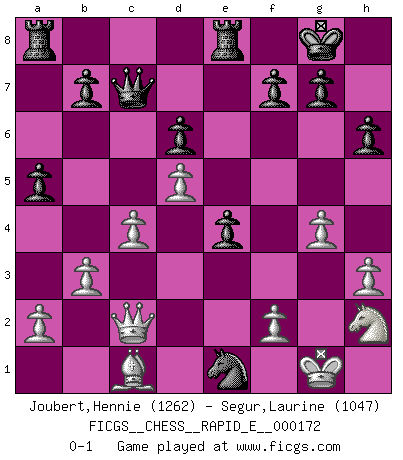 Last move : 0-1 2016 August 3 15:34:28 [Event "FICGS__CHESS__RAPID_E__000172"] [Site "FICGS"] [Date "2016.04.17"] [Round "1"] [White "Joubert,Hennie"] [Black "Segur,Laurine"] [Result "0-1"] [WhiteElo "1262"] [BlackElo "1047"] 1.e4 c5 2.Nf3 d6 3.d4 cxd4 4.Nxd4 Nf6 5.Nc3 a6 6.Be3 e5 7.Nb3 Be6 8.Be2 Be7 9.Nd5 Nxd5 10.exd5 Bf5 11.O-O O-O 12.Rc1 Nd7 13.c4 a5 14.Nd2 Nc5 15.Nf3 Bf6 16.b3 Re8 17.h3 Qc7 18.g4 Be4 19.Nh2 h6 20.Bf3 Bd3 21.Re1 e4 22.Be2 Bb2 23.Bxd3 Nxd3 24.Qc2 Bxc1 25.Bxc1 Nxe1 0-1 Sicilian : Najdorf, Byrne (English) attack Kingside Castling by player White (move 11) Kingside Castling by player Black (move 11) Player Black won this chess game. Follow this game move after move (download)Chess is a cold bath for the mind. (Sir John Simon) Die Idee von Capablanca, Schach als Fach in den Schulen zu lehren, ist großartig. (Fidel Castro) Yo creo que el Ajedrez posee una magia que es también una ayuda en la edad avanzada. Una rodilla reumática es olvidada durante una partida de Ajedrez y otros eventos pueden parecer algo sin importancia comparada a una catástrofe en el tablero de Ajedrez. (Vlastimil Hort) Ce qui est bien, c'est d'avoir tout un tas de pièces en prise : l'adversaire ne peut en prendre qu'une à la fois. Cité par Thierry Audin. A computer lets you make more mistakes faster than any invention in human history - with the possible exceptions of handguns and tequila. (Mitch Ratcliffe)
