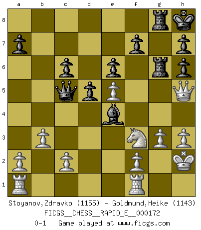 Last move : 0-1 2016 July 23 2:37:57 [Event "FICGS__CHESS__RAPID_E__000172"] [Site "FICGS"] [Date "2016.04.17"] [Round "1"] [White "Stoyanov,Zdravko"] [Black "Goldmund,Heike"] [Result "0-1"] [WhiteElo "1155"] [BlackElo "1143"] 1.e4 d5 2.e5 Bf5 3.d4 e6 4.Nf3 c5 5.Bb5+ Nc6 6.Bxc6+ bxc6 7.h3 Qb6 8.O-O Nh6 9.b3 Be7 10.Re1 O-O 11.Bxh6 gxh6 12.Nc3 Kh8 13.Na4 Qc7 14.Nxc5 Rg8 15.Kh2 Rg7 16.Nd2 Rag8 17.g3 Qb6 18.Qh5 Rg6 19.Nf3 Bxc5 20.dxc5 Qxc5 21.Rf1 Be4 0-1 This chess game has been lost on time (started : 2016.04.17 10:14:7) Scandinavian (centre counter) defense Kingside Castling by player White (move 8) Kingside Castling by player Black (move 10) Player Black won this chess game. Follow this game move after move (download)There are two classes of men; those who are content to yield to circumstances and who play whist; those who aim to control circumstances, and who play Chess. (Mortimer Collins) Je älter ich werde, um so mehr schätze ich die Bauern. (Paul Keres) Durante una competencia de Ajedrez, un Maestro de Ajedrez deberá ser una combinación de presa de caza y un Monge. (Alexander Alekhine) Les Echecs, c'est l'art de la guerre sans les charniers, c'est la résurrection des morts tombés au champ d'honneur, l'espoir perpétuel, la suprématie de l'intelligence sur la force, la culture de l'esprit. (F. Szpiner) A good player is always lucky. (Capablanca)