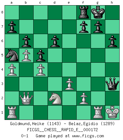 Last move : 0-1 2016 June 20 21:12:13 [Event "FICGS__CHESS__RAPID_E__000172"] [Site "FICGS"] [Date "2016.04.17"] [Round "1"] [White "Goldmund,Heike"] [Black "Belaz,Egidio"] [Result "0-1"] [WhiteElo "1143"] [BlackElo "1289"] 1.b4 e5 2.Bb2 d6 3.e3 Nf6 4.Nf3 Nc6 5.b5 Na5 6.c4 b6 7.d3 Bg4 8.Be2 Be7 9.O-O c6 10.a4 e4 11.dxe4 Nxe4 12.Qd4 Nf6 13.Nbd2 c5 14.Qc3 O-O 15.h3 Be6 16.Ng5 Bf5 17.Bf3 h6 18.Bxa8 Qxa8 19.Ngf3 Nh5 20.g4 Bf6 21.Qa3 Be4 22.Nxe4 Bxb2 23.Qxb2 Qxe4 24.Nd2 Qe7 25.gxh5 Qg5+ 26.Kh1 Qxh5 27.Rg1 Qxh3+ 0-1 Polish (Sokolsky) opening Kingside Castling by player White (move 9) Kingside Castling by player Black (move 14) Player Black won this chess game. Follow this game move after move (download)Personally, I rather look forward to a computer program winning the world Chess Championship. Humanity needs a lesson in humility. (Richard Dawkings) Jeder Fehler erscheint unglaublich dumm, wenn andre ihn begehen. (Georg Christoph Lichtenberg) Ser exitoso en el Ajedrez te permite descubrir tu propia personalidad. Eso es lo que deseo para los niños de mi clase. (Saudin Robovic) On n'a jamais que l'âge auquel on a commence à jouer aux échecs car après on cesse de vieillir. (Capablanca) The Internet is so big, so powerful and pointless that for some people it is a complete substitute for life. (Andrew Brown)