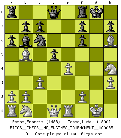 Last move : 1-0 2016 June 13 8:53:26 [Event "FICGS__CHESS__NO_ENGINES_TOURNAMENT__000085"] [Site "FICGS"] [Date "2016.04.17"] [Round "1"] [White "Ramos,Francis"] [Black "Zdana,Ludek"] [Result "1-0"] [WhiteElo "1488"] [BlackElo "1800"] 1.e4 e5 2.Nf3 Nc6 3.Bb5 Bb4 4.O-O Nf6 5.c3 Bc5 6.Re1 Ng4 7.d4 Bb6 8.h3 Nf6 9.Bg5 O-O 10.dxe5 d5 11.exf6 gxf6 12.Bh6 Bxh3 13.gxh3 a6 14.Nh4 1-0 Ruy Lopez (Spanish Opening) Kingside Castling by player White (move 4) Kingside Castling by player Black (move 9) Player White won this chess game. Follow this game move after move (download)Fischer, who may or may not be mad as a hatter, has every right to be horrified. (Jeremy Silman) Wer sich die Fähigkeit anerziehen will im Schach selbstständig zu denken, der muß alles meiden, was leblos ist: ausgeklügelte Theorien, die sich auf sehr wenige Beispiele und eine Menge Hirngespinste stützen. (Emanuel Lasker) Los tropiezos estan todos ahí en el tablero, esperando que se cometan. (Savielly Tartakover) La menace est plus forte que l'exécution. (Aaron Nimzovitch) The mind is like a parachute, it only functions when its open. (Unknown)