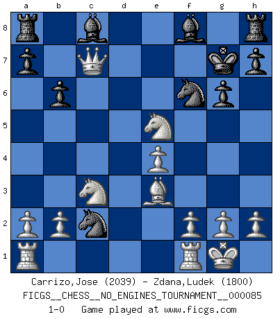 Last move : 1-0 2016 June 8 19:48:44 [Event "FICGS__CHESS__NO_ENGINES_TOURNAMENT__000085"] [Site "FICGS"] [Date "2016.04.17"] [Round "1"] [White "Carrizo,Jose"] [Black "Zdana,Ludek"] [Result "1-0"] [WhiteElo "2039"] [BlackElo "1800"] 1.e4 b6 2.d4 d6 3.Nc3 g6 4.Be3 Nc6 5.Nf3 Nb4 6.Bc4 Nf6 7.O-O e5 8.dxe5 dxe5 9.Bxf7+ Kxf7 10.Qxd8 Nxc2 11.Nxe5+ Kg7 12.Qxc7+ 1-0 Owen defense Kingside Castling by player White (move 7) Player White won this chess game. Follow this game move after move (download)When you don't know what to play, wait for an idea to come into your opponent's mind. You may be sure that idea will be wrong. (Siegbert Tarrasch) Ich weiss nicht was Gott gegen mich auf 1.e4 antworten würde. (Robert James Fischer) Bobby es el jugador de Ajedrez mas fino que este país jamás haya producido. Su memoria para las movidas, su brillantez en soñar combinaciones y su feróz determinación por la victoria son algo extraño. (John Collins) Les réformistes prétendent que les progrès de la théorie conduiront à la disparition des échecs, et qu'il faut, pour leur rendre vie, en remanier les règles. En réalité, qu'exprime cette affirmation? Le mépris de l'intuition, de l'imagination et de tous les autres éléments qui font des échecs un art. (Alexander Alekhine) The worth of a book is to be measured by what you can carry away from it. (James Bryce)