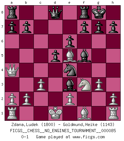 Last move : 0-1 2016 May 28 18:22:36 [Event "FICGS__CHESS__NO_ENGINES_TOURNAMENT__000085"] [Site "FICGS"] [Date "2016.04.17"] [Round "1"] [White "Zdana,Ludek"] [Black "Goldmund,Heike"] [Result "0-1"] [WhiteElo "1800"] [BlackElo "1143"] 1.d4 d5 2.Nf3 Nf6 3.Bf4 Bf5 4.c3 e6 5.Nbd2 c5 6.Qa4+ Nbd7 7.dxc5 Bxc5 8.Ne5 O-O 9.g3 Nxe5 10.Bxe5 Ne4 11.Nf3 Bxf2+ 12.Kd1 Be3 0-1 Queen's Bishop game Kingside Castling by player Black (move 8) Player Black won this chess game. Follow this game move after move (download)The beauty of a move lies not in its' appearance but in the thought behind it. (Siegbert Tarrasch) Auf jeden Fall musst du zuerst Rechtsanwalt werden, damit du deine eigenen Interessen und die deiner Familie vertreten kannst. [Brief an seinen Sohn] (José Raúl Capablanca) La última cosa en que Fischer estaba interesado era en tonterías, siempre y cuando el Ajedrez estuviera involucrado. (Elie Agur) Seul un grand joueur sait à quel point il joue faiblement. (Xavier Tartacover) To be champion requires more than simply being a strong player; one has to be a strong human being as well. (Anatoly Karpov)