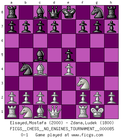 Last move : 0-1 2016 July 9 13:5:46 [Event "FICGS__CHESS__NO_ENGINES_TOURNAMENT__000085"] [Site "FICGS"] [Date "2016.04.17"] [Round "1"] [White "Elsayed,Mostafa"] [Black "Zdana,Ludek"] [Result "0-1"] [WhiteElo "2000"] [BlackElo "1800"] 1.e4 e5 2.Nf3 Nc6 3.Bc4 Nb4 4.O-O Bc5 0-1 This chess game has been lost on time (started : 2016.04.17 12:18:19) King's pawn game Kingside Castling by player White (move 4) Player Black won this chess game. Follow this game move after move (download)Chess is no whit inferior to the violin, and we have a large number of professional violinists. (Mikhail Botvinnik) Gewöhnliche Menschen denken nur daran, wie sie ihre Zeit verbringen. Ein intelligenter Mensch versucht, sie auszunutzen. (Arthur Schopenhauer) En un gambito tu regalas un Peón por el bién de tomar un juego perdido. (Samuel Standige Boden) Celui qui prend des risques peut perdre, celui qui n'en prend pas perd toujours. (Xavier Tartacover) However beautiful the strategy, you should occasionally look at the results. (Winston Churchill)