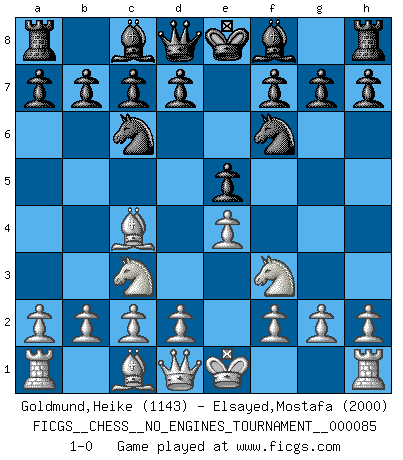 Last move : 1-0 2016 July 9 13:5:46 [Event "FICGS__CHESS__NO_ENGINES_TOURNAMENT__000085"] [Site "FICGS"] [Date "2016.04.17"] [Round "1"] [White "Goldmund,Heike"] [Black "Elsayed,Mostafa"] [Result "1-0"] [WhiteElo "1143"] [BlackElo "2000"] 1.e4 e5 2.Nf3 Nf6 3.Nc3 Nc6 4.Bc4 1-0 This chess game has been lost on time (started : 2016.04.17 12:18:19) Petrov Three knights game Player White won this chess game. Follow this game move after move (download)Later, I began to succeed in decisive games. Perhaps because I realized a very simple truth: not only was I worried, but also my opponent. (Mikhail Tal) Stil? Ich habe keinen Stil! (Anatoly Karpov) Buenas posiciones no logran ganar juegos, buenas movidas sí. (Gerald Abrahams) La victoire dans une partie d'Echecs appartient la plupart du temps à celui qui voit un peu plus loin que l'adversaire. (Lasker) Always two there are. No more no less. A master, and an apprentice. (Master Yoda in Star Wars ep.1)