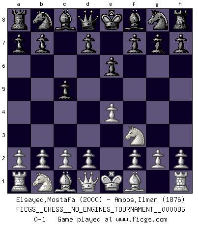 Last move : 0-1 2016 July 9 13:5:46 [Event "FICGS__CHESS__NO_ENGINES_TOURNAMENT__000085"] [Site "FICGS"] [Date "2016.04.17"] [Round "1"] [White "Elsayed,Mostafa"] [Black "Ambos,Ilmar"] [Result "0-1"] [WhiteElo "2000"] [BlackElo "1876"] 1.e4 e6 2.Nf3 c5 0-1 This chess game has been lost on time (started : 2016.04.17 12:18:19) French defense Player Black won this chess game. Follow this game move after move (download)Let the perfectionist play postal. (Yasser Seirawan) Um sich vor der Gefahr einer Erkältung zu schützen, sorge der wanderlustige König beizeiten für ein brauchbares Versteck. (Aaron Nimzowitsch) Desconfianza es la característica mas necesaria de un jugador de Ajedrez. (Siegbert Tarrasch) Aucun coup ne doit être joué sans but. (Pedro Damiano) An expert is a man who has made all the mistakes which can be made in a very narrow field. (Niels Bohr)