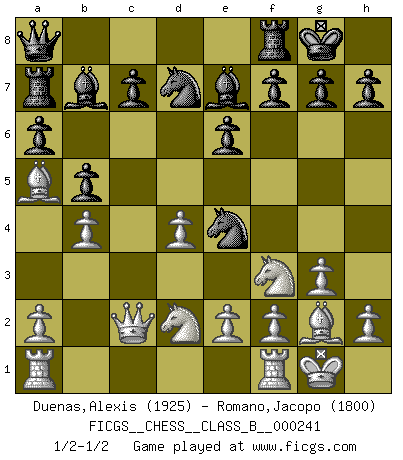 Last move : 1/2-1/2 2016 April 20 15:57:47 [Event "FICGS__CHESS__CLASS_B__000241"] [Site "FICGS"] [Date "2016.04.17"] [Round "1"] [White "Duenas,Alexis"] [Black "Romano,Jacopo"] [Result "1/2-1/2"] [WhiteElo "1925"] [BlackElo "1800"] 1.d4 Nf6 2.c4 e6 3.g3 d5 4.Nf3 Be7 5.Bg2 O-O 6.O-O dxc4 7.Qc2 a6 8.Qxc4 b5 9.Qc2 Bb7 10.Bd2 Nbd7 11.Ba5 Ra7 12.Nbd2 Qa8 13.b4 Ne4 1/2-1/2 Catalan Opening Kingside Castling by player Black (move 5) Kingside Castling by player White (move 6) This chess game ended in a draw. Follow this game move after move (download)We must make sure that Chess will not be like a dead language, very interesting, but for a very small group. (Sytze Faber) Frage: Gibt es etwas was Sie mehr lieben als Autobahnen ohne Tempobegrenzungen? - Antwort: Deutsche Frauen ohne Tempobegrenzungen. (Loek van Wely) Jugadores de primera clase pierden en contra de jugadores de segunda clase porque los jugadores de segunda clase a veces juegan una partida de primer clase. (Siegbert Tarrasch) Les erreurs sont comme les malheurs, elles n'arrivent jamais seules. (Siegbert Tarrasch) Computers are like Old Testament gods; lots of rules and no mercy. (Joseph Campbell)