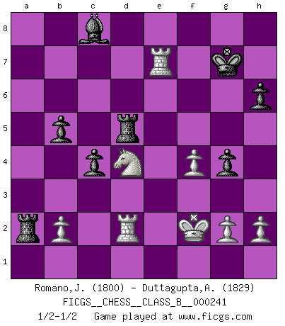 Last move : 1/2-1/2 2016 August 5 22:25:18 [Event "FICGS__CHESS__CLASS_B__000241"] [Site "FICGS"] [Date "2016.04.17"] [Round "1"] [White "Romano,Jacopo"] [Black "Duttagupta,Aniruddha"] [Result "1/2-1/2"] [WhiteElo "1800"] [BlackElo "1829"] 1.Nf3 d5 2.d4 Nf6 3.c4 e6 4.Nc3 c6 5.Bg5 h6 6.Bh4 dxc4 7.e4 g5 8.Bg3 b5 9.Be2 Bb7 10.O-O Nbd7 11.Ne5 Bg7 12.Nxd7 Nxd7 13.Bd6 a6 14.e5 c5 15.d5 Nxe5 16.dxe6 Nd3 17.exf7+ Kxf7 18.Bxd3 cxd3 19.Qxd3 Qf6 20.Rad1 Rhd8 21.Qg3 c4 22.a4 Bc6 23.f4 g4 24.Be5 Qf5 25.Bxg7 Kxg7 26.Ne2 Qe4 27.Qf2 Qc2 28.Nd4 Qxf2+ 29.Kxf2 Bd7 30.axb5 axb5 31.Rd2 Bc8 32.Re1 Ra2 33.R1e2 Rd5 34.Re7+ 1/2-1/2 Reti Opening Kingside Castling by player White (move 10) This chess game ended in a draw. Follow this game move after move (download)Bobby Fischer's current state of mind is indeed a tragedy. One of the world's greatest Chess players - the pride and sorrow of American Chess. (Frank Brady) Im Hotelzimmer gab es nur zwei Schaben. (Über die Turnierbedingungen) (Peter Swidler) Una de estas pequeñas movidas modestas pudieran ser mas molestas a tu oponente que la amenaza mas grande. (Siegbert Tarrasch) Il a essayé de se convaincre qu'il pourrait empêcher toutes les erreurs et ne jamais perdre. L'horreur ! Gary Kasparov au sujet de Robert Fischer. Tomorrow's what you make of it. (Horatio Caine, C.S.I. Miami)