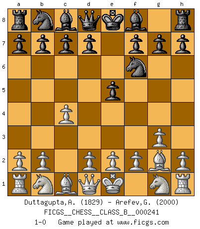 Last move : 1-0 2016 July 10 13:5:25 [Event "FICGS__CHESS__CLASS_B__000241"] [Site "FICGS"] [Date "2016.04.17"] [Round "1"] [White "Duttagupta,Aniruddha"] [Black "Arefev,German"] [Result "1-0"] [WhiteElo "1829"] [BlackElo "2000"] 1.c4 e5 2.g3 Nf6 3.Bg2 1-0 This chess game has been lost on time (started : 2016.04.17 22:16:55) English Opening Player White won this chess game. Follow this game move after move (download)It's just you and your opponent at the board and you're trying to prove something. (Bobby Fischer) Alles was ich jemals tun will ist Schach spielen. (Robert James Fischer) Por esta medida (el intervalo entre Fischer y sus contemporaneos), yo le considero el mas grande campeón mundial. (Garry Kasparov) Le système Elo représente seulement une moyenne. Il est simplement un indicateur de votre stabilité. (Anatoli Karpov) Strategy without tactics is the slowest route to victory. Tactics without strategy is the noise before defeat. (Sun Tzu)