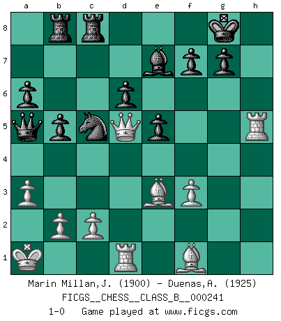 Last move : 1-0 2016 July 7 12:30:52 [Event "FICGS__CHESS__CLASS_B__000241"] [Site "FICGS"] [Date "2016.04.17"] [Round "1"] [White "Marin Millan,Jose Antonio"] [Black "Duenas,Alexis"] [Result "1-0"] [WhiteElo "1900"] [BlackElo "1925"] 1.e4 c5 2.Nf3 d6 3.d4 cxd4 4.Nxd4 Nf6 5.Nc3 a6 6.Be3 e5 7.Nb3 Be6 8.f3 Be7 9.Qd2 O-O 10.O-O-O Nbd7 11.g4 b5 12.a3 Nb6 13.g5 Nfd7 14.Na5 Qc7 15.Kb1 Rab8 16.h4 Rfc8 17.Ka1 Nc5 18.Nd5 Nxd5 19.exd5 Bxd5 20.Qxd5 Qxa5 21.g6 hxg6 22.h5 gxh5 23.Rxh5 1-0 Sicilian : Najdorf, Byrne (English) attack Kingside Castling by player Black (move 9) Queenside Castling by player White (move 10) Player White won this chess game. Follow this game move after move (download)Place the contents of the Chess box in a hat, shake them up vigorously, pour them on the board from a height of two feet, and you get the style of Steinitz. (H. E. Bird) Der beste Spieler in einem Turnier gewinnt es nie. Er landet auf Platz zwei oder drei. (Siegbert Tarrasch) Buenas posiciones no logran ganar juegos, buenas movidas sí. (Gerald Abrahams) Les échecs, c'est l'art d'analyser. (Mikhail Botvinnik) Work expands to fill the time available. (C. Northcote Parkinson, in Parkinson's Laws)