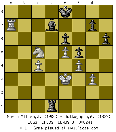 Last move : 0-1 2017 July 9 11:14:48 [Event "FICGS__CHESS__CLASS_B__000241"] [Site "FICGS"] [Date "2016.04.17"] [Round "1"] [White "Marin Millan,Jose Antonio"] [Black "Duttagupta,Aniruddha"] [Result "0-1"] [WhiteElo "1900"] [BlackElo "1829"] 1.e4 e6 2.d4 d5 3.Nc3 Nf6 4.e5 Nfd7 5.f4 c5 6.Nf3 Nc6 7.Be3 Be7 8.Be2 O-O 9.Qd2 a6 10.O-O b5 11.Nd1 b4 12.Nf2 a5 13.c4 dxc4 14.dxc5 Bxc5 15.Bxc5 Nxc5 16.Rfc1 c3 17.bxc3 b3 18.Rcb1 Rb8 19.Qxd8 Rxd8 20.axb3 Nxb3 21.Ra3 Nbd4 22.Rxb8 Nxe2+ 23.Kf1 Ng3+ 24.Ke1 Nxb8 25.hxg3 Nc6 26.Ne4 h6 27.Nd6 Bd7 28.Nc4 Ra8 29.Nb6 Rd8 30.Nd2 Kf8 31.Nbc4 Be8 32.Nxa5 Nxa5 33.Rxa5 Rd3 34.Rc5 Rxg3 35.Kf2 Rd3 36.Ne4 Ke7 37.Nd6 Rd2+ 38.Kf3 Bd7 39.Rc7 f5 40.Nb7 Ra2 41.Nc5 Rd2 42.Ke3 Kd8 43.Ra7 Rd1 44.g3 Rd5 45.Nb7+ Ke7 46.c4 Rd1 47.Na5 Ke8 48.Nb3 Rb1 49.Nc5 Rd1 0-1 This chess game has been lost on time (started : 2016.04.17 22:16:55) French : Steinitz, Boleslavsky variation Kingside Castling by player Black (move 8) Kingside Castling by player White (move 10) Player Black won this chess game. Follow this game move after move (download)The combination player thinks forward; he starts from the given position, and tries the forceful moves in his mind. (Emanuel Lasker) Mit sehr nachdenklichem Gesicht schreitet Bobby durch den Turniersaal. Was ist passiert?, fragt Lombardy. Ich stehe schlecht, antwortet Fischer. Lombardy: Dann biete doch einfach Remis an. Fischer: So schlecht stehe ich nun auch wieder nicht! (Robert James Fischer) La táctica fluye a partir de una posición superior. (Bobby Fischer) La vie est comme un jeu d'échecs : nous esquissons un plan, mais celui-ci est tributaire de ce que daignent faire l'adversaire aux échecs et le destin dans la vie. (Arthur Schopenhauer) A person who never made a mistake never tried anything new. (Albert Einstein)