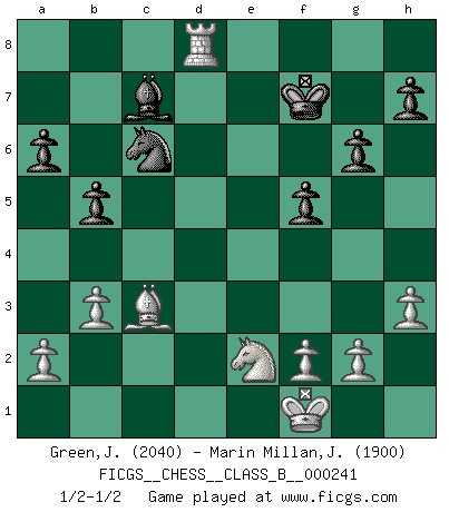 Last move : 1/2-1/2 2017 January 12 18:49:56 [Event "FICGS__CHESS__CLASS_B__000241"] [Site "FICGS"] [Date "2016.04.17"] [Round "1"] [White "Green,Jonathan"] [Black "Marin Millan,Jose Antonio"] [Result "1/2-1/2"] [WhiteElo "2040"] [BlackElo "1900"] 1.e4 e5 2.Nf3 Nc6 3.Bb5 a6 4.Ba4 Nf6 5.O-O Be7 6.Re1 b5 7.Bb3 d6 8.c3 O-O 9.h3 Nb8 10.d4 Nbd7 11.Nbd2 Bb7 12.Bc2 c5 13.Nf1 cxd4 14.cxd4 exd4 15.Ng3 Re8 16.Nxd4 Bf8 17.Bf4 g6 18.Qd2 Qb6 19.Nf3 Nc5 20.Be3 Qc6 21.Nd4 Nfxe4 22.Bxe4 Nxe4 23.Nxc6 Nxd2 24.Na5 Nc4 25.Nxb7 Rab8 26.Nxd6 Bxd6 27.Bd4 f5 28.b3 Ne5 29.Kf1 Kf7 30.Rad1 Nc6 31.Rxe8 Rxe8 32.Bc3 Rd8 33.Ne2 Bc7 34.Rxd8 1/2-1/2 Ruy Lopez : Closed Kingside Castling by player White (move 5) Kingside Castling by player Black (move 8) This chess game ended in a draw. Follow this game move after move (download)It is not a move, even the best move that you must seek, but a realizable plan. (Eugene Znosko-Borovsky) Dass jemand wie Surab Asmaiparaschwili, der selbst Elopunkte gekauft hat , Vize-Präsident der Fide werden konnte, sagt schon einges über den Zustand dieser Organisation aus. (Joel Lautier) La señal de un Gran Maestro es su habilidad de ganar una partida rápidamente y sin dolor. (Irving Chernev) Aidez vos pièces, elles vous aideront. (Paul Morphy) The beginning is the most important part of the work. (Plato)