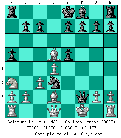 Last move : 0-1 2016 August 7 0:52:32 [Event "FICGS__CHESS__CLASS_F__000177"] [Site "FICGS"] [Date "2016.04.19"] [Round "1"] [White "Goldmund,Heike"] [Black "Salinas,Loreva"] [Result "0-1"] [WhiteElo "1143"] [BlackElo "0803"] 1.e4 d6 2.d4 Nf6 3.Bd3 Bg4 4.Nf3 Nc6 5.Be3 Nb4 6.e5 Nfd5 7.Bd2 Qd7 8.Be2 Qf5 9.Na3 a5 10.c3 Bxf3 11.Bxf3 Nd3+ 12.Kf1 dxe5 13.Bxd5 Qxf2+ 0-1 King's pawn Opening Player Black won this chess game. Follow this game move after move (download)You know you're going to lose. Even when I was ahead I knew I was going to lose. - On playing against Fischer. (Andrew Soltis) Ich organisiere ein großes Turnier, was mich etwa 120000 Dollar kostet. Ich denke, das ist das erste Mal in der Schachgeschichte, daß ein Schachgroßmeister auch als Mäzen auftritt. (Miguel Najdorf) Yo no creo en la psicología. Yo creo en las buenas movidas. (Bobby Fischer) Vous m'avez demandé de vous exposer quel est le fondement de la prière. Je ne fais que préparer les pièces du jeu sur la table... Nous sera-t-il permis d'en adopter les règles et si nous les appliquons scrupuleusement nous ne tarderons pas à faire mat le Roi divin ! Il ne pourra échapper à nos mains. (Sainte Thérèse d'Avila, Chemin de perfection) Statistics can be made to prove anything - even the truth. (Author unknown)