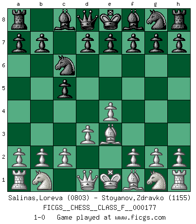 Last move : 1-0 2016 July 21 2:20:41 [Event "FICGS__CHESS__CLASS_F__000177"] [Site "FICGS"] [Date "2016.04.19"] [Round "1"] [White "Salinas,Loreva"] [Black "Stoyanov,Zdravko"] [Result "1-0"] [WhiteElo "0803"] [BlackElo "1155"] 1.e4 c5 2.d3 Nc6 3.Be3 1-0 This chess game has been lost on time (started : 2016.04.19 18:28:12) Sicilian defense Player White won this chess game. Follow this game move after move (download)Chess is mental torture. (Garry Kasparov) Spielt Blackmar-Diemer-Gambit, und das Matt kommt von selbst! (Emil Joseph Diemer) Cualquier cambio de material en una posición debe venir por medio de un mate, una captura o promoción de Peón. (Purdy) Aux échecs, les retours au sommet sont rares : les dommages psychologiques consécutifs à une défaite sont trop sévères. (Daily Telegraph) Chess, like love, like music, has the power to make people happy. (Siegbert Tarrasch)