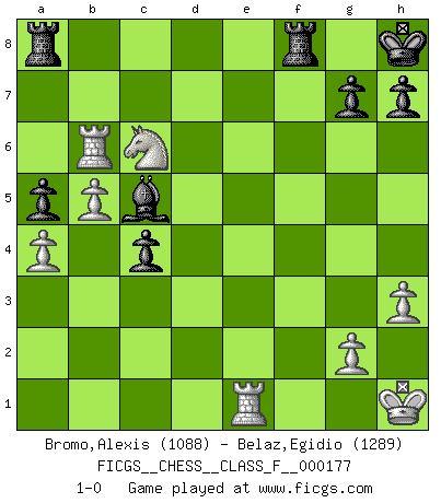 Last move : 1-0 2016 November 11 16:7:33 [Event "FICGS__CHESS__CLASS_F__000177"] [Site "FICGS"] [Date "2016.04.19"] [Round "1"] [White "Bromo,Alexis"] [Black "Belaz,Egidio"] [Result "1-0"] [WhiteElo "1088"] [BlackElo "1289"] 1.d4 e6 2.c4 Nf6 3.Nc3 Bb4 4.Bd2 O-O 5.a3 Be7 6.e3 d6 7.Nf3 a5 8.b4 b6 9.b5 c6 10.a4 c5 11.d5 exd5 12.Nxd5 Nxd5 13.e4 Nf6 14.Bd3 Bg4 15.h3 Be6 16.O-O Kh8 17.e5 dxe5 18.Bc2 Bxc4 19.Re1 Bd6 20.Bc3 Qe7 21.Nxe5 Qc7 22.Bb3 Be6 23.Bxe6 fxe6 24.f4 Nd5 25.Bb2 Nd7 26.Nc6 Bxf4 27.Rxe6 N7f6 28.Bxf6 Nxf6 29.Qf3 Nd5 30.Qxd5 Qf7 31.Rae1 Qc7 32.Re7 Qd6 33.Qxd6 Bxd6 34.Rb7 c4 35.Rxb6 Bc5+ 36.Kh1 1-0 Queen's pawn Kingside Castling by player Black (move 4) Kingside Castling by player White (move 16) Player White won this chess game. Follow this game move after move (download)Checkers is for tramps. (Paul Morphy) Weshalb minderdergeübte Spieler mit g2-g4 beginnen? Die betreffenden sind unschlüssig, ob sie nun rechts (h4) oder links (f4) beginnen sollen, und in ihrer Ratlosigkeit entschliessen sie sich nach guter Bürgerart dazu, den goldenen Mittelweg zu wählen. (Aaron Nimzowitsch) Peones: ellos son el alma de esta partida, solos forman el ataque y la defensa. (Philidor) Psychologiquement, tu dois avoir confiance en toi même, mais cette confiance doit être basée sur des faits. (Robert Fischer) The ultimate in disposing one's troops is to be without ascertainable shape. Then the most penetrating spies cannot pry in nor can the wise lay plans against you. (Sun Tzu)