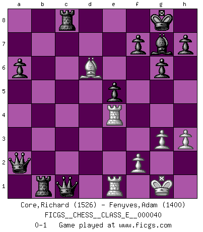 Last move : 0-1 2007 July 6 1:40:7 [Event "FICGS__CHESS__CLASS_E__000040"] [Site "FICGS"] [Date "2007.03.25"] [Round "1"] [White "Core,Richard"] [Black "Fenyves,Adam"] [Result "0-1"] [WhiteElo "1526"] [BlackElo "1400"] 1.Nf3 d5 2.d4 Nf6 3.e3 g6 4.Ne5 Nbd7 5.Bb5 c6 6.Bd3 Bg7 7.O-O O-O 8.Re1 Nxe5 9.e4 Ned7 10.e5 Ne8 11.Qf3 e6 12.c4 a6 13.Qh3 b5 14.Na3 bxc4 15.Be2 c5 16.Nc2 cxd4 17.Nxd4 Nxe5 18.Bh6 Qb6 19.Be3 Qxb2 20.Nf3 Nxf3+ 21.Bxf3 Qb5 22.Rab1 Qa5 23.Bb6 Qa3 24.Be3 e5 25.Bxd5 Ra7 26.Qxc8 Rc7 27.Qg4 Nf6 28.Be4 Nxg4 29.Bb6 R7c8 30.h3 Nf6 31.Re2 Nxe4 32.Rxe4 Qxa2 33.Rbe1 c3 34.Rc1 c2 35.g3 Rb8 36.Bc5 Rfc8 37.Bd6 Rb1 38.Rce1 c1Q 0-1 Reti Opening Kingside Castling by player White (move 7) Kingside Castling by player Black (move 7) Promotion Queen by player Black (move 38) Player Black won this chess game. Follow this game move after move (download)We don't really know how the game was invented, though there are suspicions. As soon as we discover the culprits, we'll let you know. (Bruce Pandolfini) Ich würde die 30 stärksten Spieler der USA im Simultanspiel besiegen. (José Raúl Capablanca) Estaba muy claro de que el punto vulnerable del Gran Maestro Americano (Bobby Fischer) radicaba en las posiciones de doble filo, colgantes, irracionales, donde el siempre falló en encontrar un triunfo aún en una posición de clara victoria. (Efim Geller) Ce qui est bien, c'est d'avoir tout un tas de pièces en prise : l'adversaire ne peut en prendre qu'une à la fois. Cité par Thierry Audin. Hardware: the parts of a computer that can be kicked. (Jeff Persis)