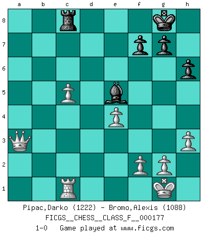 Last move : 1-0 2016 June 9 20:22:16 [Event "FICGS__CHESS__CLASS_F__000177"] [Site "FICGS"] [Date "2016.04.19"] [Round "1"] [White "Pipac,Darko"] [Black "Bromo,Alexis"] [Result "1-0"] [WhiteElo "1222"] [BlackElo "1088"] 1.e4 e5 2.Nf3 Nc6 3.Bb5 d6 4.Bxc6+ bxc6 5.Nc3 Ba6 6.d3 h6 7.O-O Nf6 8.a3 Qe7 9.h3 d5 10.exd5 cxd5 11.Re1 e4 12.Nxd5 Nxd5 13.Rxe4 Qxe4 14.dxe4 Nb6 15.Be3 Rd8 16.Qe1 Be7 17.Bxb6 axb6 18.Qc3 O-O 19.Qxc7 Bc5 20.Ne5 Bd6 21.Qxb6 Bxe5 22.Qxa6 Bxb2 23.Rb1 Be5 24.c4 Ra8 25.Qc6 Rxa3 26.Qc5 Bf6 27.Qxa3 Rc8 28.Rc1 Be5 29.c5 1-0 Ruy Lopez : Old Steinitz defense Kingside Castling by player White (move 7) Kingside Castling by player Black (move 18) Player White won this chess game. Follow this game move after move (download)Chess is a cold bath for the mind. (Sir John Simon) Kleine Schachspieler machen Mist, und große Schachspieler machen Mist, aber große machen weniger Mist. (Fritz Sämisch) Cuando veas una buena jugada, trata de encontrar otra mejor. (Emanuel Lasker) Dans le domaine de la peinture, de la gravure et de la sculpture, dès la première décennie de notre siècle, les artistes abandonnent la représentation de la partie d'échecs pour se concentrer sur les pièces, sur les échiquiers et sur toutes les variations auxquelles les unes et les autres peuvent donner lieu. On passe en quelque sorte d'un thème social à un thème musical (au sens de la musica médiévale, c'est-à-dire d'une notion qui inclue le rythme, l'harmonie, la construction et la déconstruction, etc.). Graphiquement et picturalement, l'échiquier apparaît comme une structure ouverte, dynamique, d'une richesse infinie, autorisant toutes les combinatoires et débouchant sur des mouvements et des rythmes de nature exponentielle. (Michel Pastoureau) There is a computer disease that anybody who works with computers knows about. It's a very serious disease and it interferes completely with the work. The trouble with computers is that you 'play' with them ! (Richard P. Feynman)