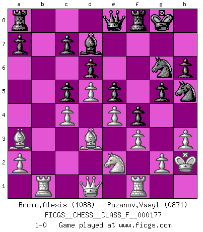 Last move : 1-0 2016 September 12 22:18:37 [Event "FICGS__CHESS__CLASS_F__000177"] [Site "FICGS"] [Date "2016.04.19"] [Round "1"] [White "Bromo,Alexis"] [Black "Puzanov,Vasyl"] [Result "1-0"] [WhiteElo "1088"] [BlackElo "0871"] 1.d4 Nc6 2.c4 e5 3.e3 Bb4+ 4.Nc3 d6 5.d5 Bxc3+ 6.bxc3 Nce7 7.e4 h6 8.f3 f5 9.Bd3 f4 10.Ne2 Nf6 11.Ba3 b6 12.O-O O-O 13.Nc1 Qe8 14.c5 bxc5 15.c4 g5 16.h3 Nh5 17.Ne2 Bd7 18.Kh2 Ng6 19.Rb1 1-0 This chess game has been lost on time (started : 2016.04.19 18:28:12) Queen's pawn : Lundin (Kevitz-Mikenas) defense Kingside Castling by player White (move 12) Kingside Castling by player Black (move 12) Player White won this chess game. Follow this game move after move (download)No Chess Grandmaster is normal; they only differ in the extent of their madness. (Viktor Korchnoi) Ja, jede Frau in Holland liebt mich bestimmt, und alle Männer hassen mich. (Loek van Wely) Debió haber existido una vez en que los hombres eran semidióses, de otra manera no hubiesen podido inventar el Ajedrez. (Gustav Schenk) Les échecs sont plus proches de l'art de l'assassinat que de l'art de la guerre. (Arturo Perez-Reverte) The meaning of life is that it is to be lived, and it is not to be traded and conceptualized and squeezed into a pattern of systems. (Bruce Lee)