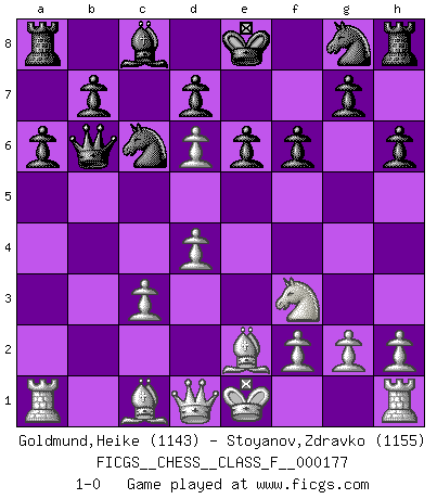 Last move : 1-0 2016 August 15 19:40:3 [Event "FICGS__CHESS__CLASS_F__000177"] [Site "FICGS"] [Date "2016.04.19"] [Round "1"] [White "Goldmund,Heike"] [Black "Stoyanov,Zdravko"] [Result "1-0"] [WhiteElo "1143"] [BlackElo "1155"] 1.e4 c5 2.b4 cxb4 3.a3 bxa3 4.Nxa3 e6 5.d4 h6 6.Nf3 Nc6 7.Nb5 Qb6 8.c3 Be7 9.e5 f6 10.Be2 a6 11.Nd6+ Bxd6 12.exd6 1-0 Sicilian : wing gambit, Carlsbad variation Player White won this chess game. Follow this game move after move (download)Spassky will not be psyched out by Fischer. (Mike Goodall) Ich war schon mal beim Dopingtest. Da musste ich Urin abgeben, während Dritte zusahen. (Elisabeth Pähtz) Si no le temes a Spassky, entonces elimino el elemento del dinero. (Jim Slater) On entre au jeu d'Echecs comme on entre en Religion. Pour le joueur d'Echecs, la partie d'Echecs c'est l'office, la messe, le défilé du 1er Mai, le dépôt de gerbe au Monument aux Morts. C'est un drame sacré. (Michel Roos) Internal peace cannot coexist with external war. (Don Groves)