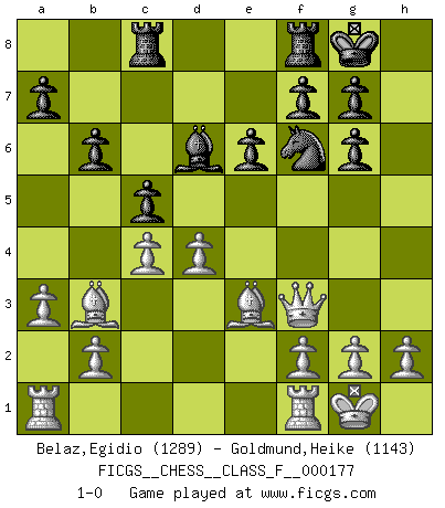 Last move : 1-0 2016 June 16 19:54:34 [Event "FICGS__CHESS__CLASS_F__000177"] [Site "FICGS"] [Date "2016.04.19"] [Round "1"] [White "Belaz,Egidio"] [Black "Goldmund,Heike"] [Result "1-0"] [WhiteElo "1289"] [BlackElo "1143"] 1.e4 d5 2.exd5 Qxd5 3.Nf3 Nf6 4.Nc3 Qa5 5.Bc4 Bf5 6.Ng5 e6 7.O-O Bd6 8.d3 Nbd7 9.a3 c6 10.Nf3 Nb6 11.Bb3 O-O 12.Bd2 Nbd5 13.Nxd5 Nxd5 14.Bxa5 b6 15.Bd2 Rac8 16.c4 Nf6 17.d4 Ne4 18.Be3 c5 19.Nh4 Bg6 20.Nxg6 hxg6 21.Qg4 Nf6 22.Qf3 1-0 Scandinavian (centre counter) defense Kingside Castling by player White (move 7) Kingside Castling by player Black (move 11) Player White won this chess game. Follow this game move after move (download)If I win a tournament, I win it by myself. I do the playing. Nobody helps me. (Bobby Fischer) Modernes Schach erfordert enorme Anspannung. Es ist für einen normalen Menschen unmöglich das auszuhalten. (Viktor Kortschnoi) La táctica fluye a partir de una posición superior. (Bobby Fischer) En blitz, le Cavalier l'emporte sur le Fou. (Vlastimil Hort) My poor ole parrot... Is not in the circulation of displays ....poo hoo hoo :) (Wayne Lowrance's enigma)