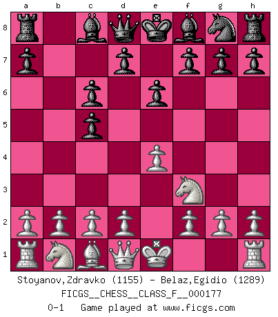 Last move : 0-1 2016 July 15 13:48:4 [Event "FICGS__CHESS__CLASS_F__000177"] [Site "FICGS"] [Date "2016.04.19"] [Round "1"] [White "Stoyanov,Zdravko"] [Black "Belaz,Egidio"] [Result "0-1"] [WhiteElo "1155"] [BlackElo "1289"] 1.e4 c5 2.Nf3 Nc6 3.Bb5 e6 4.Bxc6 bxc6 0-1 This chess game has been lost on time (started : 2016.04.19 18:28:12) Sicilian : Nimzovich-Rossolimo attack (without ...d6) Player Black won this chess game. Follow this game move after move (download)To avoid losing a piece, many a person has lost the game. (Savielly Tartakover) Später, ... hatte ich zunehmend Erfolg in entscheidenden Partien. Vielleicht weil ich eine einfache Wahrheit erkannte: nicht nur ich hatte Angst, auch mein Gegner. (Mikhail Nekhemyevich Tal) El Ajedrez es tortura mental. (Garry Kasparov) Si le désir cupide (et stupide) de gagner est une inépuisable source de souffrance, une combinaison brillante sur l'échiquier est une découverte : le coquelicot qui s'épanouit lorsque apparaît la Voie Lactée. (Arrabal) There is no vagueness without wind. (Chinese proverb)