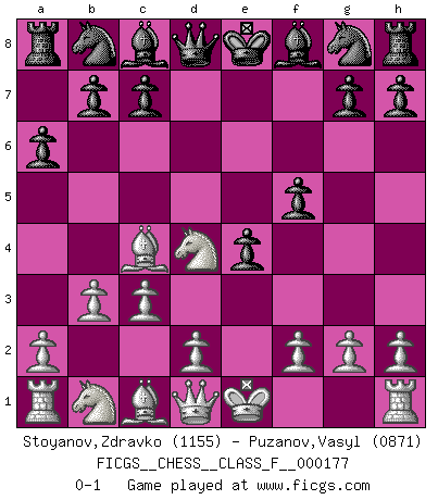 Last move : 0-1 2016 August 20 8:16:4 [Event "FICGS__CHESS__CLASS_F__000177"] [Site "FICGS"] [Date "2016.04.19"] [Round "1"] [White "Stoyanov,Zdravko"] [Black "Puzanov,Vasyl"] [Result "0-1"] [WhiteElo "1155"] [BlackElo "0871"] 1.e4 e5 2.Nf3 d5 3.exd5 e4 4.Nd4 Qxd5 5.c3 f5 6.b3 a6 7.Bc4 Qd8 0-1 This chess game has been lost on time (started : 2016.04.19 18:28:12) QP counter-gambit (elephant gambit) Player Black won this chess game. Follow this game move after move (download)Chess is a matter of delicate judgment, knowing when to punch and how to duck. (Bobby Fischer) Es war undenkbar für die Behörden, dass ein sowjetischer Großmeister auf diese Art und Weise [Fischer-Taimanov 6:0] verliert, ohne dass es eine politischer Erklärung dafür gäbe. (Mark Taimanov) A la fecha, Fischer esta simplemente un nivel arriba de todos los mejores jugadores de Ajedrez del mundo. (John Jacobs) La vie est comme un jeu d'échecs : nous esquissons un plan, mais celui-ci est tributaire de ce que daignent faire l'adversaire aux échecs et le destin dans la vie. (Arthur Schopenhauer) First of all, we have to go back to the classical time control. (Anatoly Karpov)