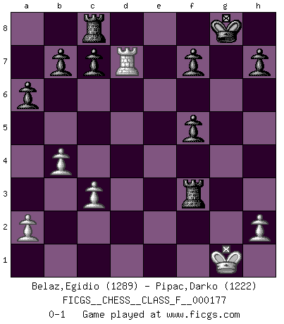 Last move : 0-1 2016 July 2 9:44:48 [Event "FICGS__CHESS__CLASS_F__000177"] [Site "FICGS"] [Date "2016.04.19"] [Round "1"] [White "Belaz,Egidio"] [Black "Pipac,Darko"] [Result "0-1"] [WhiteElo "1289"] [BlackElo "1222"] 1.e4 e5 2.f4 exf4 3.Nf3 d5 4.Nc3 d4 5.Nd5 Nf6 6.Nxf6+ Qxf6 7.Bd3 Bg4 8.O-O Nc6 9.Bb5 a6 10.Bd3 Bd6 11.Qe1 Bxf3 12.Rxf3 O-O 13.c3 dxc3 14.dxc3 Ne5 15.Rxf4 Nxd3 16.Rxf6 Nxe1 17.Bf4 gxf6 18.Bh6 Rfe8 19.Rxe1 Re5 20.g3 f5 21.Bf4 Rxe4 22.Rd1 Bxf4 23.gxf4 Rxf4 24.Rd7 Rc8 25.b4 Rf3 0-1 KGA : Abbazia defense (Classical defense, Modern defense!) Kingside Castling by player White (move 8) Kingside Castling by player Black (move 12) Player Black won this chess game. Follow this game move after move (download)Chess is imagination. (David Bronstein) Ich möchte Schüler heranbilden, die das Vermögen haben, selbst zu denken und Kritik zu üben. (Emanuel Lasker) Muchos jugadores de Ajedrez se sorprendían cuando después de la partida, Fischer explicaba con calma: 'Yo ya había analizado esta posibilidad' en una posición en la cual yo creía que no era posible de prever desde la apertura. (Mikhail Tal) Roi des jeux et jeu des rois, les échecs portent en eux un sentiment d'infini. Ils donnent à celui qui s'est efforcé d'en approfondir les arcanes l'impression de n'être pas à la mesure de l'homme; en fait, ils constituent un résumé de l'univers, un microcosme, et figurent cette grande échelle qui, dans les plans de la lumière descend jusqu'à la matière, qui des abîmes insondables remonte jusqu'en l'infini de Dieu. (Pyrame) A good aphorism is too hard for the tooth of time, and is not worn away with the centuries, although it serves as food for every speech. (Friedrich Nietzsche)