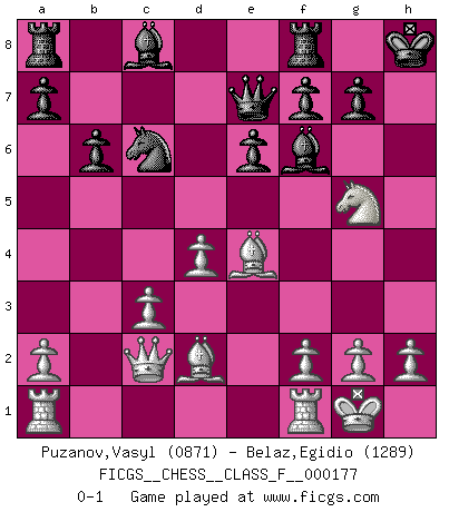 Last move : 0-1 2016 September 2 0:52:13 [Event "FICGS__CHESS__CLASS_F__000177"] [Site "FICGS"] [Date "2016.04.19"] [Round "1"] [White "Puzanov,Vasyl"] [Black "Belaz,Egidio"] [Result "0-1"] [WhiteElo "0871"] [BlackElo "1289"] 1.e4 c5 2.d4 cxd4 3.c3 Nf6 4.e5 Nd5 5.cxd4 e6 6.Nc3 Bb4 7.Bd2 Nxc3 8.bxc3 Be7 9.Nf3 b6 10.Bd3 Nc6 11.O-O O-O 12.Qc2 d6 13.exd6 Bf6 14.Bxh7+ Kh8 15.Be4 Qxd6 16.Ng5 Qe7 0-1 This chess game has been lost on time (started : 2016.04.19 18:28:12) Sicilian : Smith-Morra gambit Kingside Castling by player White (move 11) Kingside Castling by player Black (move 11) Player Black won this chess game. Follow this game move after move (download)What would Chess be without silly mistakes ? (Kurt Richter) Ich brauche nur einen Blick auf das Schachbrett zu werfen, und weiß schon, was in der Stellung steckt, was geschehen kann und was geschehen wird. Alle übrigen suchen und prüfen, ich aber weiß es! (José Raúl Capablanca) Mis oponentes también hacen buenas movidas. A veces yo no tomo esas cosas en consideración. (Bobby Fischer) Le jeu d'échecs est comme rejeté hors du temps. (Antoine de Saint-Exupéry) Creativity is allowing yourself to make mistakes. Art is knowing which ones to keep. (Scott Adams)