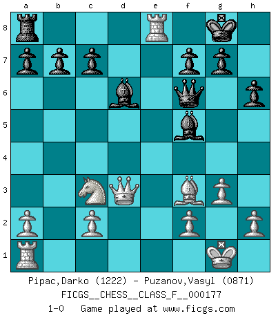 Last move : 1-0 2016 August 28 21:9:49 [Event "FICGS__CHESS__CLASS_F__000177"] [Site "FICGS"] [Date "2016.04.19"] [Round "1"] [White "Pipac,Darko"] [Black "Puzanov,Vasyl"] [Result "1-0"] [WhiteElo "1222"] [BlackElo "0871"] 1.e4 e5 2.Nf3 d5 3.d3 dxe4 4.Nxe5 exd3 5.Qxd3 Bd6 6.Nf3 Nf6 7.Bg5 O-O 8.Nc3 h6 9.Bxf6 Qxf6 10.Be2 Nc6 11.Nd5 Qxb2 12.O-O Ne5 13.Nxe5 Qxe5 14.g3 Be6 15.Nc3 Rfe8 16.Rfe1 Qf6 17.Bf3 Bf5 18.Rxe8+ 1-0 This chess game has been lost on time (started : 2016.04.19 18:28:12) QP counter-gambit (elephant gambit) Kingside Castling by player Black (move 7) Kingside Castling by player White (move 12) Player White won this chess game. Follow this game move after move (download)All Chess players should have a hobby. (Savielly Tartakower) Wenn Du einsam bist, wenn Du Dich in der Welt wie ein Fremder fühlst, spiele Schach. Das wird Deinen Geist erheben und Dein Ratgeber im Kampf sein. (Aristoteles) Debemos de asegurarnos de que el Ajedrez no se convierta en un lenguaje muerto, muy interesante, pero tan solo para un grupo muy pequeño. (Sytze Faber) On peut tirer plus d'utilité d'une partie perdue que de 100 parties gagnées. (Capablanca) I have opinions of my own - strong opinions - but I don't always agree with them. (George Bush)