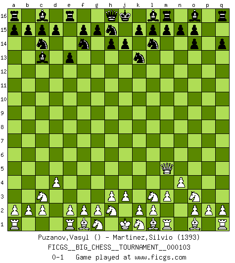Last move : 0-1 2016 August 31 19:58:24 [Event "FICGS__BIG_CHESS__TOURNAMENT__000103"] [Site "FICGS"] [Date "2016.04.19"] [Round "1"] [White "Puzanov,Vasyl"] [Black "Martinez,Silvio"] [Result "0-1"] [WhiteElo ""] [BlackElo "1393"] 1.n2-n4 p16-o14 2.d2-d4 b16-c14 3.c1-p13 k16-l14 4.j2-l3 g16-f14 5.p1-o3 q15-q14 6.p13-o14 p15-o14 7.h1-m5 e15-e13 8.b1-c3 j15-k13 9.m2-m3 f16-c13 0-1 Follow this game move after move (download)The beauty of a move lies not in its' appearance but in the thought behind it. (Siegbert Tarrasch) Es ist peinlich, dass ich nie Weltmeister wurde. Es wäre leicht, Leonid Breschnjew als Ursache vorzuschieben, dessen Apparat den Vorzeigekommunisten Anatoli Karpow in allem unterstützte. Aber Garri Kasparow zum Beispiel, der ebenfalls von den Sowjets unerwünscht war, hat trotz der Widerstände den WM-Titel erobert. (Viktor Kortschnoi) Si no le temes a Spassky, entonces elimino el elemento del dinero. (Jim Slater) Donnez-moi un Cavalier en 6e et je gagnerais toutes mes parties. (Steinitz) A generalist learns less and less about more and more until he knows nothing about everything. (Author unknown)