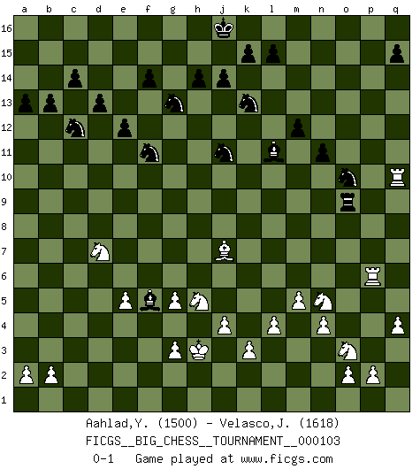 Last move : 0-1 2016 September 24 20:19:0 [Event "FICGS__BIG_CHESS__TOURNAMENT__000103"] [Site "FICGS"] [Date "2016.04.19"] [Round "1"] [White "Aahlad,Yeturu"] [Black "Velasco,Jose Maria"] [Result "0-1"] [WhiteElo "1500"] [BlackElo "1618"] 1.m2-m4 j15-k13 2.j2-k4 h16-o10 3.h2-g4 m15-m13 4.h1-n6 d15-d13 5.n6-l6 c15-c14 6.e2-e4 n15-n13 7.l1-p5 e15-e13 8.q2-q4 l16-p12 9.f1-b5 g16-j15 10.b1-c3 c16-l8 11.g2-g3 f16-b12 12.d2-d4 o10-j10 13.c1-h6 o16-f8 14.p1-o3 a15-a13 15.n2-n4 l8-g4 16.h6-f8 b12-f8 17.l6-f6 f8-k4 18.h3-g4 e16-e14 19.f2-f3 k4-j5 20.g1-e2 e14-g14 21.f6-f15 b16-d15 22.f15-f9 a16-f16 23.f9-p9 p16-o14 24.o1-f9 d15-b14 25.k1-h2 j5-o10 26.p9-p10 f16-f10 27.e4-e5 j10-f7 28.l2-l3 h15-g13 29.o3-n5 n13-n12 30.c3-e4 n12-n11 31.e2-f4 f10-f9 32.b5-f9 f7-f9 33.m1-m3 p12-o13 34.p10-p15 o14-n12 35.p15-o15 q16-o16 36.o15-q13 o10-l7 37.m3-o3 o13-p14 38.q13-n10 m13-m12 39.q1-q3 n12-o10 40.j1-j2 p14-m11 41.n10-n7 l7-k8 42.n7-k7 k8-m10 43.o3-o6 b14-c12 44.e1-e3 g14-f14 45.e3-b3 b15-b13 46.h2-j4 m16-m13 47.e4-c5 m11-c2 48.b3-b8 c2-n12 49.o6-f6 f9-d9 50.f6-f14 g15-f14 51.k2-k3 d9-d4 52.c5-d7 d4-f2 53.j2-h3 f2-f3 54.f4-h5 f3-f11 55.k7-f11 g13-f11 56.q3-o3 k16-h15 57.a1-f1 e13-e12 58.f1-f6 j15-h13 59.j4-k6 h15-g13 60.k6-m7 n12-p10 61.j3-j4 m13-o13 62.p5-l9 m10-l11 63.f6-f10 p10-q9 64.m4-m5 o10-m11 65.l9-j7 o13-o3 66.n5-o3 l11-p7 67.l3-l4 o16-o7 68.f10-q10 q9-n12 69.b8-m8 h13-j11 70.m7-n5 o7-o9 71.m8-p8 p7-l11 72.g4-g5 m11-o10 73.p8-p6 n12-f5 0-1 Follow this game move after move (download)At this time Fischer is simply a level above all the best Chessplayers in the world. (John Jacobs) Dass jemand wie Surab Asmaiparaschwili, der selbst Elopunkte gekauft hat , Vize-Präsident der Fide werden konnte, sagt schon einges über den Zustand dieser Organisation aus. (Joel Lautier) Vive, pierde y aprende al observar a tu oponente como gana. (Amber Steenbock) Psychologiquement, tu dois avoir confiance en toi même, mais cette confiance doit être basée sur des faits. (Robert Fischer) There is no instance of a country having benefited from prolonged warfare. (Sun Tzu)