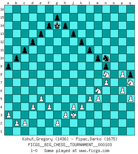 Last move : 1-0 2017 January 12 18:55:8 [Event "FICGS__BIG_CHESS__TOURNAMENT__000103"] [Site "FICGS"] [Date "2016.04.19"] [Round "1"] [White "Kohut,Gregory"] [Black "Pipac,Darko"] [Result "1-0"] [WhiteElo "1436"] [BlackElo "1675"] 1.j2-k4 j15-k13 2.h1-o7 h15-g13 3.o7-o15 g16-f14 4.h2-g4 p16-o14 5.o15-d5 k16-l14 6.p1-o3 p15-p14 7.b1-c3 o16-p15 8.e2-e4 b15-b14 9.f1-b5 c16-b15 10.m2-m4 m15-m14 11.l1-o4 b16-a14 12.n2-n3 l16-o13 13.o1-a14 b15-a14 14.d5-a8 a14-d11 15.a8-d11 h16-h15 16.d11-h15 j16-h15 17.d2-d3 c15-c14 18.c1-d2 e15-e14 19.c3-d5 f16-b12 20.g1-j2 d15-d13 21.d2-c3 q16-o16 22.k1-h2 o14-q13 23.c3-p15 q13-p15 24.d5-f6 p15-n14 25.e1-e3 n14-m12 26.m1-m3 o13-l10 27.q1-m1 o16-o11 28.b5-c4 m16-o16 29.m1-l1 c14-c13 30.l2-l4 n15-n13 31.l4-l5 f14-h13 32.f2-f4 g13-j12 33.o3-n5 f15-f14 34.n5-l4 e14-e13 35.h2-k3 d13-d12 36.c4-h9 a16-d16 37.l4-k6 k13-j11 38.h9-l6 b12-d10 39.m3-m2 d10-f12 40.o4-f12 h13-f12 41.o2-o4 l10-k11 42.a2-a3 o11-p11 43.e4-e5 o16-o11 44.a1-d1 e16-o16 45.d3-d4 k11-h9 46.l6-h9 j11-h9 47.j1-h2 o11-n11 48.l1-n1 h9-j7 49.k3-h4 j12-h10 50.k6-l4 h10-g8 51.f6-g8 j7-g8 52.j2-g3 m12-k11 53.g3-j4 k11-j9 54.l4-n5 o16-o12 55.k4-m5 f12-g10 56.m5-k6 l14-k12 57.h4-f3 g8-j7 58.f3-h4 j9-l8 59.k6-l8 j7-l8 60.g4-f6 g10-j9 61.k2-k4 k12-l10 62.f6-h5 q15-q13 63.h5-k6 l10-n9 64.k6-l8 n9-l8 65.j4-k2 c13-c12 66.k2-j4 a15-a13 67.h4-k3 b14-b13 68.j4-g5 c12-c11 69.g5-j4 b13-b12 70.j4-l3 b12-b11 71.j3-j4 b11-b10 72.e3-b3 a13-a12 73.b3-b7 a12-a11 74.d1-d3 a11-a10 75.d3-b3 a10-a9 76.b7-l7 l15-l14 77.b3-b6 m14-m13 78.b6-p6 p11-p6 79.n5-p6 d16-o16 80.p6-n5 l8-n7 81.k3-j5 n7-o5 82.n3-n4 o5-q6 83.p2-p3 q6-o7 84.n5-o3 j9-k11 85.n1-d1 k11-m10 86.d1-d3 m10-n8 87.l7-n7 o12-o11 88.d3-b3 n8-o6 89.n7-n11 o11-n11 90.m2-n2 o16-o11 91.b3-b6 n13-n12 92.b6-o6 o7-m8 93.o6-o11 n11-o11 94.m4-m5 p14-p13 95.n2-n1 k15-k13 96.n1-d1 l14-l13 97.d1-d3 m13-m12 98.d3-b3 l13-l12 99.b3-b7 m12-m11 100.l3-k5 n12-n11 101.b7-q7 q13-q12 102.q7-p7 o11-o13 103.o3-n5 m8-o9 104.p7-p9 n11-n10 105.j5-l6 o9-p11 106.o4-o5 p13-p12 107.l6-m4 o13-o11 108.p3-p4 q12-q11 109.p4-p5 q11-q10 110.p9-p6 j14-j13 111.n5-p4 k13-k12 112.p6-o6 o11-o6 113.p4-o6 p11-q9 114.m4-n6 p12-p11 115.k5-m6 l12-l11 116.h2-j3 m11-m10 117.q2-q4 n10-n9 118.o6-m7 p11-p10 119.o5-o6 q9-o10 120.o6-o7 q10-q9 121.n6-l7 h15-g14 122.n4-n5 o10-q11 123.n5-n6 q11-p9 124.p5-p6 q9-q8 125.m7-o6 p9-n10 126.n6-n7 p10-p9 127.q4-q5 n10-l9 128.o6-q7 l9-n10 129.l7-n8 p9-p8 130.o7-p8 1-0 Follow this game move after move (download)I have added these principles to the law: get the Knights into action before both Bishops are developed. (Emanuel Lasker) Man braucht nicht immer den besten Zug zu spielen: Ein Zug muß aktiv, unternehmungslustig, korrekt und schön sein. (David Bronstein) Aún deseo matar a Fischer. (Boris Spassky) Comme les marins qui ont mille raisons différentes d'aller en mer, les joueurs d'échecs en ont tout autant avant de s'installer devant une table et jouer... (Vincent Bertignac, philosophe) Don't be discouraged. It's often the last key in the bunch that opens the lock. (Author unknown)