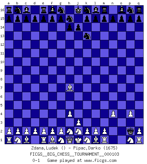 Last move : 0-1 2016 May 29 0:19:2 [Event "FICGS__BIG_CHESS__TOURNAMENT__000103"] [Site "FICGS"] [Date "2016.04.19"] [Round "1"] [White "Zdana,Ludek"] [Black "Pipac,Darko"] [Result "0-1"] [WhiteElo ""] [BlackElo "1675"] 1.n2-n4 j15-k13 2.o1-h7 h16-o10 3.h3-h4 o10-o2 4.p2-p4 o2-p2 0-1 Follow this game move after move (download)Chess holds its master in its own bonds, shackling the mind and brain so that the inner freedom of the very strongest must suffer. (Albert Einstein) Die unerbitterlichsten Regeln im Schach sind die Ausnahmen. (Savielly Grigorievitsch Tartakower) Preferería tener un Peón que un dedo. (Reuben Fine) Les pièces de l'échiquier étaient impitoyables. Elles le retenaient, elles l'absorbaient. Il y avait de l'horreur en cela, mais aussi une harmonie unique. Car, qu'y a-t-il dans le monde, à part les échecs ? (V. Nabokov) The weakness of an artist is dogma. (Josh Waitzkin)