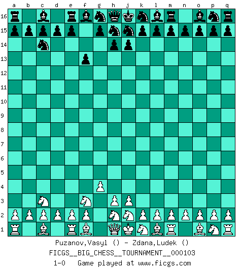 Last move : 1-0 2016 May 27 15:11:17 [Event "FICGS__BIG_CHESS__TOURNAMENT__000103"] [Site "FICGS"] [Date "2016.04.19"] [Round "1"] [White "Puzanov,Vasyl"] [Black "Zdana,Ludek"] [Result "1-0"] [WhiteElo ""] [BlackElo ""] 1.b1-c3 b16-c14 2.g2-g4 f15-f13 3.g1-f3 1-0 Follow this game move after move (download)Bobby just drops the pieces and they fall on the right squares. (Miguel Najdorf) Sie bekommen vielleicht den Eindruck, dass die Spitzenspieler überhaupt gar nicht so stark sind. Aber das stimmt nicht. Es ist eine Illusion. Mit einem Computer an der Seite ist es sehr leicht, Urteile zu fällen, aber wenn man alleine am Brett sitzt, sieht die Sache ganz anders aus. (Vladimir Kramnik) Puntos débiles o agujeros en la posición de tu oponente deben de ser ocupados por piezas, no Peones. (Siegbert Tarrasch) La conception d'un plan est le processus par lequel un joueur exploite les avantages de sa position tout en s'efforçant d'en réduire au minimum les inconvénients. Afin de garantir le succès, un plan doit toujours se fonder sur un diagnostic objectif des particularités d'une position. La conception d'un plan est d'autant plus difficile que la position est équilibrée, et grandement facilitée lorsqu'il n'existe qu'un seul plan susceptible de répondre aux exigences de la position. (Harry Golombek) Establishing goals is all right if you don't let them deprive you of interesting detours. (Doug Larson)