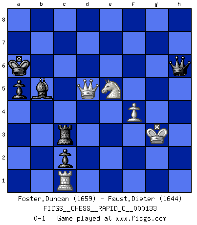 Last move : 0-1 2016 August 19 20:7:50 [Event "FICGS__CHESS__RAPID_C__000133"] [Site "FICGS"] [Date "2016.04.20"] [Round "1"] [White "Foster,Duncan"] [Black "Faust,Dieter"] [Result "0-1"] [WhiteElo "1659"] [BlackElo "1644"] 1.e4 e6 2.d4 d5 3.e5 c5 4.c3 Bd7 5.Nf3 Nc6 6.a3 f6 7.Bd3 Qc7 8.O-O O-O-O 9.Qe2 c4 10.Bc2 Nge7 11.Bf4 h6 12.Nbd2 g5 13.Bg3 f5 14.h3 Na5 15.Rfc1 Rg8 16.b4 Nac6 17.a4 Kb8 18.Ne1 Nxd4 19.cxd4 Nc6 20.b5 Nxd4 21.Qd1 f4 22.Bh2 Nxc2 23.Nxc2 Qxe5 24.Nf3 Qd6 25.Ne3 h5 26.g4 hxg4 27.Nxg4 Bg7 28.Nxg5 Bxa1 29.Nf7 Qe7 30.Nxd8 Be5 31.Nxb7 Kxb7 32.Qf3 c3 33.Kh1 Qa3 34.Bxf4 Bxf4 35.Qxf4 Rh8 36.Kg2 c2 37.f3 Rf8 38.Qe3 Qxa4 39.h4 Rc8 40.h5 Qb4 41.h6 Bxb5 42.h7 a6 43.Qh6 Qc3 44.Kg3 Qb2 45.Qf4 a5 46.Ne5 Ka6 47.Ng6 Qg7 48.Qd6+ Kb7 49.Qxe6 Qxh7 50.Qxd5+ Ka6 51.Ne5 Qh6 52.f4 Rc3+ 0-1 French : Advance variation Kingside Castling by player White (move 8) Queenside Castling by player Black (move 8) Player Black won this chess game. Follow this game move after move (download)Chess is above all, a fight ! (Emanuel Lasker) Das Schach ist nichts für kleine Geister, es beansprucht einen vollen Mann, der sich nicht sklavisch an das Überlieferte hält, sondern selbständig die Tiefen des Spiels zu ergründen sucht. (Wilhelm Steinitz) A la fecha, Fischer esta simplemente un nivel arriba de todos los mejores jugadores de Ajedrez del mundo. (John Jacobs) Les Cavaliers se révèlent fort utiles dans les positions fermées. D'habitude, les Fous sont un peu plus forts que les Cavaliers dans les positions ouvertes. Qu'on le veuille ou non, il restera toujours des exceptions ! Luck has a peculiar habit of favoring those who don't depend on it. (Author unknown)