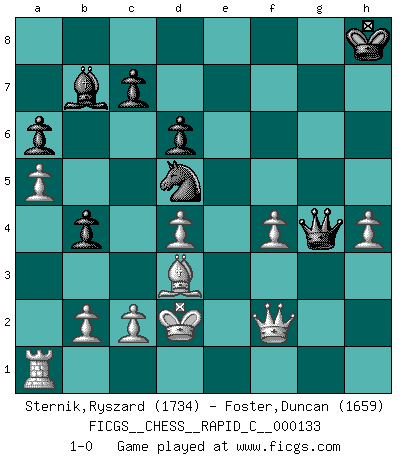 Last move : 1-0 2016 July 18 23:42:4 [Event "FICGS__CHESS__RAPID_C__000133"] [Site "FICGS"] [Date "2016.04.20"] [Round "1"] [White "Sternik,Ryszard"] [Black "Foster,Duncan"] [Result "1-0"] [WhiteElo "1734"] [BlackElo "1659"] 1.d4 b6 2.e4 Bb7 3.Bd3 g6 4.Nf3 h6 5.Nc3 a6 6.O-O Bg7 7.Re1 e6 8.Bf4 d6 9.a4 Ne7 10.a5 b5 11.Qd2 g5 12.Bg3 O-O 13.h4 g4 14.Nh2 h5 15.Qg5 Nd7 16.Qxh5 Nf6 17.Qg5 Nh7 18.Qxg4 f5 19.exf5 exf5 20.Qe2 f4 21.Qe6+ Kh8 22.Bxf4 Rxf4 23.g3 Rxf2 24.Kxf2 Qf8+ 25.Ke2 Re8 26.Kd1 Nf6 27.Qe3 b4 28.Ne2 Ned5 29.Qf2 Bh6 30.Nf4 Rxe1+ 31.Kxe1 Qe7+ 32.Qe2 Bxf4 33.gxf4 Qg7 34.Qf2 Ng4 35.Nxg4 Qxg4 36.Kd2 1-0 Queen's pawn : English defense Kingside Castling by player White (move 6) Kingside Castling by player Black (move 12) Player White won this chess game. Follow this game move after move (download)In blitz, the Knight is stronger than the Bishop. (Vlastimil Hort) Lisa Lane, amerikanische Schachmeisterin, hatte Fischer einmal als stärksten lebenden Spieler bezeichnet. Antwort: Das ist richtig, aber Lisa Lane ist eigentlich nicht in der Lage, das zu beurteilen. (Robert James Fischer) Muchos jugadores de Ajedrez se sorprendían cuando después de la partida, Fischer explicaba con calma: 'Yo ya había analizado esta posibilidad' en una posición en la cual yo creía que no era posible de prever desde la apertura. (Mikhail Tal) Un footballeur joue avec ses pieds, parfois avec sa tête. Un joueur d'échecs ne joue qu'avec sa tête. Et quand il ne joue plus, il meurt. (Jacob Murray) Ah, beer! The cause of, and the solution to, all of life's problems. (Homer Simpson)