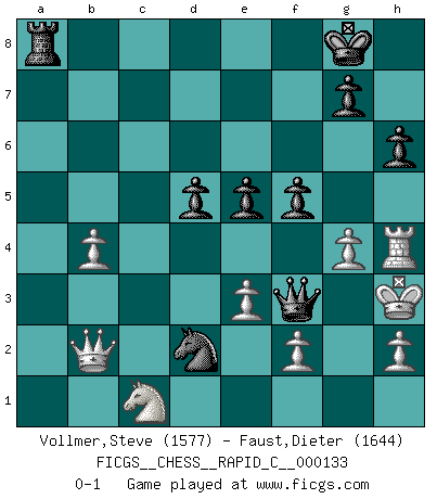 Last move : 0-1 2016 July 23 17:31:12 [Event "FICGS__CHESS__RAPID_C__000133"] [Site "FICGS"] [Date "2016.04.20"] [Round "1"] [White "Vollmer,Steve"] [Black "Faust,Dieter"] [Result "0-1"] [WhiteElo "1577"] [BlackElo "1644"] 1.Nf3 Nf6 2.d4 e6 3.g3 b5 4.Bg2 Bb7 5.O-O c5 6.a4 b4 7.c4 bxc3 8.Nxc3 cxd4 9.Qxd4 Nc6 10.Qd1 Be7 11.Bf4 O-O 12.Bd6 Rc8 13.a5 Bxd6 14.Qxd6 Nxa5 15.Qb4 Bxf3 16.Bxf3 Nc6 17.Bxc6 Rxc6 18.Rxa7 Rb6 19.Qa3 Qb8 20.Rb1 d5 21.e3 Rb3 22.Qa2 h6 23.Ra3 Rb7 24.b3 Rc8 25.Qd2 Qd6 26.Qb2 Qb4 27.Rc1 R7b8 28.Na2 Qg4 29.Ra4 Rxc1+ 30.Qxc1 Qf5 31.Rf4 Qd3 32.b4 e5 33.Rh4 Ra8 34.Qb2 Ne4 35.Nc1 Qd1+ 36.Kg2 Nd2 37.Kh3 f5 38.g4 Qf3+ 0-1 Reti Opening Kingside Castling by player White (move 5) Kingside Castling by player Black (move 11) Player Black won this chess game. Follow this game move after move (download)I am still a victim of Chess. It has all the beauty of art and much more. It cannot be commercialized. Chess is much purer than art in its social position. (Marcel Duchamp) Ich habe kein Problem mit Frauen, sondern nur mit dem Niveau ihres Schachspiels (Judith Polgar) Fischer deseaba darle a los Rusos una sopa de su propia medicina. (Larry Evans) Shah mat. Le roi est mort. Cri de fierté d'un joueur venant de terrasser son adversaire, courtoisement, sans effusion de sang. You must do what you feel is right... of course. (Obi-Wan Kenobi in Star Wars ep.4)