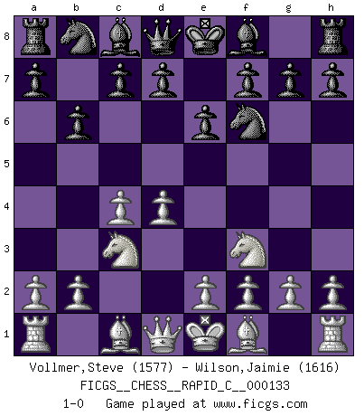 Last move : 1-0 2016 July 4 12:46:10 [Event "FICGS__CHESS__RAPID_C__000133"] [Site "FICGS"] [Date "2016.04.20"] [Round "1"] [White "Vollmer,Steve"] [Black "Wilson,Jaimie"] [Result "1-0"] [WhiteElo "1577"] [BlackElo "1616"] 1.d4 Nf6 2.c4 e6 3.Nf3 b6 4.Nc3 1-0 This chess game has been lost on time (started : 2016.04.20 11:30:54) Queen's Indian : 4.Nc3 Player White won this chess game. Follow this game move after move (download)It is not a move, even the best move that you must seek, but a realizable plan. (Eugene Znosko-Borovsky) Herr Iljumschinow ist ein etwas merkwürdiger Geschäftsmann: Er arbeitet zusammen mit Leuten wie Muammar al-Gaddafi; früher ist das Saddam Hussein gewesen. (Joel Lautier) Uno no tiene que jugar muy bien, es suficiente jugar mejor que el oponente. (Siegbert Tarrasch) On est toujours la mazette de quelqu'un d'autre. (Anonyme) Perfection is achieved, not when there is nothing more to add, but when there is nothing left to take away. (Antoine de Saint-Exupéry)