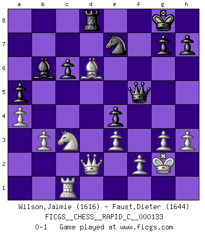 Last move : 0-1 2016 August 13 15:34:53 [Event "FICGS__CHESS__RAPID_C__000133"] [Site "FICGS"] [Date "2016.04.20"] [Round "1"] [White "Wilson,Jaimie"] [Black "Faust,Dieter"] [Result "0-1"] [WhiteElo "1616"] [BlackElo "1644"] 1.c4 e5 2.g3 Nc6 3.Bg2 Nf6 4.Nc3 Bb4 5.Nd5 Bc5 6.e3 Nxd5 7.cxd5 Ne7 8.Ne2 d6 9.O-O Bg4 10.h3 Bd7 11.b3 O-O 12.Bb2 f6 13.d4 Bb6 14.Qd2 a5 15.a4 Be8 16.Rfc1 Qd7 17.dxe5 fxe5 18.Rc4 c6 19.dxc6 bxc6 20.Ba3 Rd8 21.Rac1 Bf7 22.R4c3 Bd5 23.Rd3 Qf5 24.Nc3 Bxg2 25.Kxg2 e4 26.Rxd6 Rxd6 27.Bxd6 Rd8 0-1 English Opening Kingside Castling by player White (move 9) Kingside Castling by player Black (move 11) Player Black won this chess game. Follow this game move after move (download)The most powerful weapon in Chess is to have the next move. (David Bronstein) Als er Schachweltmeister wurde ließ er praktisch alle stärksten Sovietspieler für sich arbeiten. Wenn ein auch nur mittelmässiger Meister ein Spezialist für eine bestimmte Eröffnung war, wurde er von Karpov gerufen. Das wurde alles geheim gehalten. (Mikhail Moiseyevich Botvinik) Me siento como si fuera una pieza en una partida de Ajedrez, cuando mi oponente me indica: esa pieza no puede ser movida. (Soren Kierkegaard) Il s'avisa de me proposer d'apprendre les échecs qu'il jouait un peu... me voilà forcené des échecs. J'achète un échiquier, je m'enferme dans ma chambre, j'y passe des jours et des nuits à vouloir apprendre par cur toutes les parties. (Jean-Jacques Rousseau, Confessions) Just because you do not take an interest in politics doesn't mean politics won't take an interest in you. (Pericles 430 B.C.)