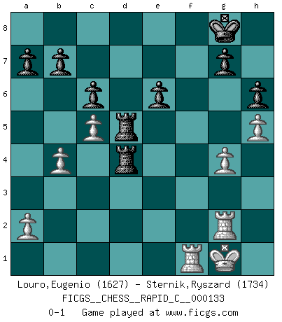 Last move : 0-1 2016 July 9 20:17:20 [Event "FICGS__CHESS__RAPID_C__000133"] [Site "FICGS"] [Date "2016.04.20"] [Round "1"] [White "Louro,Eugenio"] [Black "Sternik,Ryszard"] [Result "0-1"] [WhiteElo "1627"] [BlackElo "1734"] 1.e4 c6 2.d4 d5 3.Nc3 dxe4 4.Nxe4 Bf5 5.Ng3 Bg6 6.h4 h6 7.h5 Bh7 8.Nf3 Nd7 9.c4 Qc7 10.Bd3 Bxd3 11.Qxd3 e6 12.b3 Ngf6 13.O-O Bd6 14.Ne4 O-O 15.Nxf6+ Nxf6 16.c5 Be7 17.Ne5 Rad8 18.b4 Qxe5 19.dxe5 Rxd3 20.exf6 Bxf6 21.Rb1 Bd4 22.Bb2 Bxb2 23.Rxb2 Rfd8 24.g4 R8d5 25.f3 f5 26.Rg2 fxg4 27.fxg4 R3d4 0-1 Caro-Kann : Classical, 6.h4 Kingside Castling by player White (move 13) Kingside Castling by player Black (move 14) Player Black won this chess game. Follow this game move after move (download)Fischer is completely natural. He plays no roles. He's like a child. Very, very simple. (Zita Rajcsanyi) Heutzutage gewinnt im Turnier nicht derjenige Spieler, der weitreichende Pläne entwirft, sondern einfach jener, der Zug um Zug kämpft. (David Bronstein) El Ajedrez demanda una total concentración. (Bobby Fischer) La tactique, c'est ce que vous faites quand il y a quelque chose à faire; la stratégie, c'est ce que vous faites quand il n'y a rien à faire. (Savielli Tartacower) At work, the authority of a person is inversely proportional to the number of pens that person is carrying. (Dan Rotaru)