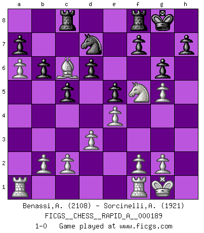Last move : 1-0 2016 June 7 19:20:13 [Event "FICGS__CHESS__RAPID_A__000189"] [Site "FICGS"] [Date "2016.05.27"] [Round "1"] [White "Benassi,Aspasio"] [Black "Sorcinelli,Andrea"] [Result "1-0"] [WhiteElo "2108"] [BlackElo "1921"] 1.e4 c5 2.Be2 Nc6 3.Nf3 e5 4.Bc4 Be7 5.d3 d6 6.Nc3 Nf6 7.O-O O-O 8.a4 Bg4 9.h3 Bxf3 10.Qxf3 Nd7 11.Qg4 Nf6 12.Qd1 Nd7 13.Nd5 Bg5 14.Bxg5 Qxg5 15.Ne3 Nf6 16.a5 Nh5 17.Qg4 Qxg4 18.hxg4 Nf6 19.g5 Nd7 20.a6 b6 21.Bd5 Rac8 22.Nf5 g6 23.Bxc6 1-0 Sicilian defense Kingside Castling by player White (move 7) Kingside Castling by player Black (move 7) Player White won this chess game. Follow this game move after move (download)I thought the most common mistake [in chess] was the first one: Learning the game :P (Garvin Gray, FICGS forum) Das Zentrum ist der Balkan des Schachbretts - Kriegshandlungen können in jedem Moment ausbrechen. (Aaron Nimzowitsch) No hay precio que sea tan grande por la cabellera del Rey enemigo. (Koblentz) J'ai vu le vaincu d'Echecs jouer des années durant dans l'espoir de la fête de la victoire. Car tu es plus riche de ce qu'elle existe si même elle n'est point pour toi. Ainsi de la perle du fond des mers. (Antoine de Saint-Exupéry) If only faces could talk... (Pat Summerall, Sportscaster during the Super Bowl)