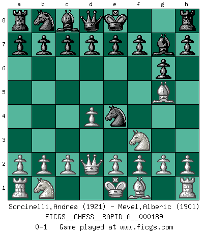 Last move : 0-1 2016 June 23 19:52:52 [Event "FICGS__CHESS__RAPID_A__000189"] [Site "FICGS"] [Date "2016.05.27"] [Round "1"] [White "Sorcinelli,Andrea"] [Black "Mevel,Alberic"] [Result "0-1"] [WhiteElo "1921"] [BlackElo "1901"] 1.d4 Nf6 2.Nf3 g6 3.Bg5 Bg7 4.Qd2 Ne4 0-1 King's Indian : Torre attack Player Black won this chess game. Follow this game move after move (download)Chess is war over the board. The object is to crush the opponents mind. (Bobby Fischer) Pläne sind die Träume des Verständigen. (Ernst Freiherr von Feuchtersleben) Yo tuve un dolor de muelas en la primer partida. En el segundo juego, tuve un dolor de cabeza. En el tercero, tuve un ataque de reumatísmo. En la cuarta partida, no me sentía muy bien. ¿Y en el quinto juego? Bueno, ¿que acaso uno tiene que ganar todos los juegos?. (Siegbert Tarrasch) Il vaut mieux sacrifier les pièces de l'adversaire. (Xavier Tartacover) The obstacle is the path. (Zen proverb)