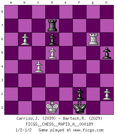 Last move : 1/2-1/2 2016 August 9 20:46:44 [Event "FICGS__CHESS__RAPID_A__000189"] [Site "FICGS"] [Date "2016.05.27"] [Round "1"] [White "Carrizo,Jose"] [Black "Bartsch,Reinhard Andrea"] [Result "1/2-1/2"] [WhiteElo "2039"] [BlackElo "2029"] 1.e4 c5 2.Nf3 d6 3.d4 cxd4 4.Nxd4 Nf6 5.Nc3 a6 6.Bg5 e6 7.f4 Be7 8.Qf3 Qc7 9.O-O-O Nbd7 10.g4 b5 11.Bxf6 Nxf6 12.g5 Nd7 13.f5 O-O 14.fxe6 Bxg5+ 15.Kb1 Nb6 16.Nd5 Nxd5 17.exd5 fxe6 18.Qg4 e5 19.Qxg5 exd4 20.Bd3 g6 21.Rhf1 Qg7 22.Rxf8+ Qxf8 23.Rf1 Qe8 24.Qh4 Ra7 25.a4 bxa4 26.Qxd4 Rb7 27.Bxa6 Rb8 28.Bd3 Qe7 29.Rf4 Qg7 30.Qxg7+ Kxg7 31.Rxa4 Kf6 32.Ra7 h5 33.c4 Bf5 34.Bxf5 gxf5 35.Kc2 f4 36.Rd7 Ke5 37.Rf7 Ke4 38.Kc3 f3 39.Rf6 Rd8 40.b4 Ke3 41.Re6+ Kf2 42.b5 Kg2 43.Kd2 f2 44.Rg6+ Kf1 45.b6 Rd7 46.Kd1 1/2-1/2 Sicilian : Najdorf, 7...Be7 Queenside Castling by player White (move 9) Kingside Castling by player Black (move 13) This chess game ended in a draw. Follow this game move after move (download)Let the perfectionist play postal. (Yasser Seirawan) Du musst Deinen Gegner in einen tiefen dunklen Wald führen wo 2+2=5 ist und wo der Weg, der wieder hinausführt, nur breit genug für einen ist. (Mikhail Nekhemyevich Tal) Todos los jugadores de Ajedrez deberían tener un pasatiempo. (Savielly Tartakower) Une platitude souvent récitée à propos des Echecs est qu'une des choses les plus difficiles à réaliser est de gagner une position gagnante. Cela ne manque pas de sens mais, pour ma part, j'ai toujours trouvé plus difficile de gagner une position perdante. (Tim Krabbe) Everything in life is luck. (Donald Trump)