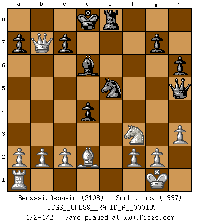 Last move : 1/2-1/2 2016 June 3 18:27:5 [Event "FICGS__CHESS__RAPID_A__000189"] [Site "FICGS"] [Date "2016.05.27"] [Round "1"] [White "Benassi,Aspasio"] [Black "Sorbi,Luca"] [Result "1/2-1/2"] [WhiteElo "2108"] [BlackElo "1997"] 1.e4 e5 2.Nf3 Nf6 3.Bc4 Nc6 4.d4 exd4 5.O-O Nxe4 6.Re1 d5 7.Bxd5 Qxd5 8.Nc3 Qa5 9.Nxe4 Be6 10.Neg5 O-O-O 11.Nxe6 fxe6 12.Rxe6 Bd6 13.Bg5 Rde8 14.Qe2 Kd7 15.Rxe8 Rxe8 16.Qd3 h6 17.Bd2 Qh5 18.h3 Ne5 19.Qb5+ Kd8 20.Qxb7 1/2-1/2 Petrov : Italian variation Kingside Castling by player White (move 5) Queenside Castling by player Black (move 10) This chess game ended in a draw. Follow this game move after move (download)The passion for playing Chess is one of the most unaccountable in the world. (H.G. Wells) Mein erstes Ziel war nicht, die Partie zu gewinnen, sondern eine Figur zu opfern. -- der junge (Wilhelm Steinitz) No hay otro maestro que tenga una voluntad terrífica de ganar. Al tablero, el irradía peligro y aún los oponentes mas fuertes tienden a congelarse como liebres cuando olfatean a una pantera. Aún sus debilidades son peligrosas. Con las blancas, su juego de apertura es predecible - te es posible hacer planes en su contra - pero es tan fuerte que tus planes casi nunca funcionan. En el juego medio, su precisión e invención son fabulosas y en finales, tú simplemente no le puedes vencer. (Experto Alemán anónimo) Ne tendez aucun piège pour le plaisir ! Ne jouez rien dans l'espoir que l'adversaire réagisse de façon stupide ! Prenez toujours pour acquis que l'adversaire va trouver le meilleur coup ! Ne jouez jamais de coup dans l'espoir que l'adversaire ne voie pas la menace ! Chacun de vos coups doit améliorer la position d'une façon ou d'une autre. Experience is the name we all give to our mistakes. (Oscar Wilde)