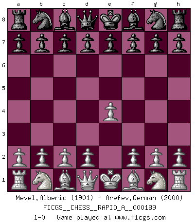 Last move : 1-0 2016 June 26 23:48:48 [Event "FICGS__CHESS__RAPID_A__000189"] [Site "FICGS"] [Date "2016.05.27"] [Round "1"] [White "Mevel,Alberic"] [Black "Arefev,German"] [Result "1-0"] [WhiteElo "1901"] [BlackElo "2000"] 1.e4 1-0 This chess game has been lost on time (started : 2016.05.27 13:11:49) King's pawn Opening Player White won this chess game. Follow this game move after move (download)One bad move nullifies forty good ones. (Horowitz) Kein Schachspieler kann gut schlafen. (H. G. Wells) En la vida, como en el Ajedrez, los Peones propios obstruyen nuestro camino. La gran fortuna de un hombre, su comodidad, placer, hijos, libros, que deberían ayudarle a ganar, con mucha frecuencia lo ponen en Jaque Mate. (Charles Buxton) La tactique, c'est ce que vous faites quand il y a quelque chose à faire; la stratégie, c'est ce que vous faites quand il n'y a rien à faire. (Savielli Tartacower) Chess is as much a mystery as women. (Purdy)