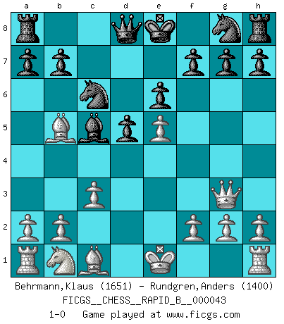 Last move : 1-0 2007 May 12 20:52:29 [Event "FICGS__CHESS__RAPID_B__000043"] [Site "FICGS"] [Date "2007.03.25"] [Round "1"] [White "Behrmann,Klaus"] [Black "Rundgren,Anders"] [Result "1-0"] [WhiteElo "1651"] [BlackElo "1400"] 1.e4 c6 2.d4 d5 3.e5 c5 4.c3 Nc6 5.Nf3 Bg4 6.dxc5 e6 7.Bb5 Bxf3 8.Qxf3 Bxc5 9.Qg3 1-0 This chess game has been lost on time (started : 2007.03.25 18:52:5) Caro-Kann : Advance variation Player White won this chess game. Follow this game move after move (download)Mistrust is the most necessary characteristic of the Chess player. (Siegbert Tarrasch) Schach ist gnadenlos. Du mußt bereit sein zu töten. (Nigel Short) La captura del Rey enemigo es la finalidad pero no el primer objetivo de la partida. (William Steinitz) Le jeu d'échecs est comme rejeté hors du temps. (Antoine de Saint-Exupéry) Happy endings are just stories that haven't finished yet. (Jane Smith in Mr & Mrs Smith)