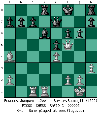 Last move : 0-1 2006 July 2 12:6:52 [Event "FICGS__CHESS__RAPID_C__000002"] [Site "FICGS"] [Date "2006.05.31"] [Round "1"] [White "Roussey,Jacques"] [Black "Sarkar,Soumojit"] [Result "0-1"] [WhiteElo "1200"] [BlackElo "1200"] 1.e4 e5 2.Nf3 Nc6 3.d4 exd4 4.c3 dxc3 5.Bc4 cxb2 6.Bxb2 d6 7.O-O Nh6 8.Nc3 Bg4 9.h3 Bh5 10.Nd5 Ne5 11.Bxe5 dxe5 12.Qb3 Bxf3 13.Qxf3 f6 14.Rac1 Bd6 15.Rfd1 Rc8 16.Ne3 Qe7 17.Nf5 Nxf5 18.Qxf5 Rd8 19.Bb5+ Kf8 20.Ba4 g6 0-1 Scotch : Goering gambit Kingside Castling by player White (move 7) Player Black won this chess game. Follow this game move after move (download)Only the player with the initiative has the right to attack. (Wilhelm Steinitz) Gewöhnliche Menschen denken nur daran, wie sie ihre Zeit verbringen. Ein intelligenter Mensch versucht, sie auszunutzen. (Arthur Schopenhauer) Por tratar de evitar la pérdida de una pieza, muchas personas han perdido una partida de Ajedrez. (Savielly Tartakover) Le thème de l'attaque double intervient d'une manière ou d'une autre dans l'immense majorité des combinaisons. (Youri Averbakh) The mind is like a parachute, it only functions when its open. (Unknown)
