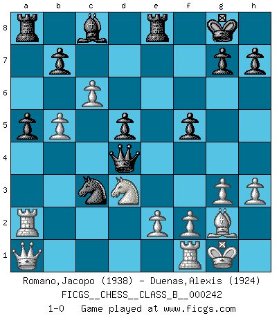 Last move : 1-0 2016 June 6 16:12:40 [Event "FICGS__CHESS__CLASS_B__000242"] [Site "FICGS"] [Date "2016.05.30"] [Round "1"] [White "Romano,Jacopo"] [Black "Duenas,Alexis"] [Result "1-0"] [WhiteElo "1938"] [BlackElo "1924"] 1.d4 f5 2.Nf3 e6 3.g3 d5 4.Bg2 Bd6 5.O-O Nf6 6.c4 c6 7.Nc3 O-O 8.Qc2 Ne4 9.Rb1 Nd7 10.b4 Ndf6 11.c5 Bb8 12.a4 Qe7 13.Nd1 Ng4 14.h3 Ngf6 15.Nb2 e5 16.dxe5 Bxe5 17.Nxe5 Qxe5 18.Nd3 Qc3 19.Qd1 a5 20.Bb2 Qc4 21.b5 cxb5 22.axb5 Re8 23.Bxf6 Nxf6 24.Rb2 Ne4 25.Qa1 Qd4 26.Ra2 Nc3 27.c6 1-0 Dutch Kingside Castling by player White (move 5) Kingside Castling by player Black (move 7) Player White won this chess game. Follow this game move after move (download)I thought the most common mistake [in chess] was the first one: Learning the game :P (Garvin Gray, FICGS forum) Um sich vor der Gefahr einer Erkältung zu schützen, sorge der wanderlustige König beizeiten für ein brauchbares Versteck. (Aaron Nimzowitsch) El ganador de una partida es aquel jugador que hace el penúltimo error. (Savielly Tartakover) L'action d'une oeuvre littéraire se déroule sur un champ de bataille. Les masques et les types du drame moderne correspondent aux pièces du jeu d'échecs. L'intrigue correspond aux coups et aux gambits, c'est à dire aux techniques du jeu telles qu'utilisées et interprétées par les joueurs. Les tactiques et les péripéties [mouvements] correspondent aux coups exécutés par l'adversaire. (Viktor Shklovsky) A cynic is a man who knows the price of everything but the value of nothing. (Oscar Wilde)