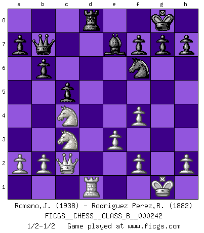 Last move : 1/2-1/2 2016 August 9 22:22:58 [Event "FICGS__CHESS__CLASS_B__000242"] [Site "FICGS"] [Date "2016.05.30"] [Round "1"] [White "Romano,Jacopo"] [Black "Rodriguez Perez,Rene"] [Result "1/2-1/2"] [WhiteElo "1938"] [BlackElo "1882"] 1.d4 e6 2.Nf3 Nf6 3.g3 d5 4.c4 Bb4+ 5.Bd2 Be7 6.Bg2 O-O 7.O-O c6 8.Qc2 Nbd7 9.Bf4 b6 10.Rd1 Bb7 11.Nc3 dxc4 12.Nd2 Nd5 13.Nxc4 Nxf4 14.gxf4 Qc7 15.e3 Rad8 16.Rab1 c5 17.d5 exd5 18.Bxd5 Nf6 19.Bxb7 Qxb7 20.Rxd8 Rxd8 21.Rd1 1/2-1/2 Queen's pawn Kingside Castling by player Black (move 6) Kingside Castling by player White (move 7) This chess game ended in a draw. Follow this game move after move (download)The only thing Chess players have in common is Chess. (Lodewijk Prins) Frage: Was machen Sie mit den Preisen? Anwort: Ich habe Angst, dass meine Freundin davon neue Kleider kauft. (Loek van Wely) Aunque la mayoría de la gente disfruta observar las partidas de los grandes Maestros de ataque, algunos de los jugadores mas notables en la historia han sido los jugadores silenciosos posicionales. Lentamente ellos te aplastan despojandote de tu espacio, congestionando tus piezas y dejandote virtualmente sin nada que hacer. (Yasser Seirawan) Mais n'est-ce pas déjà le limiter injurieusement que d'appeler les échecs un jeu? N'est-ce pas aussi une science, un art, ou quelque chose qui, comme le cercueil de Mahomet entre ciel et terre, est suspendu entre l'un et l'autre, et qui réunit un nombre incroyable de contraires ? (Stefan Zweig) Don't be irreplaceable, if you can't be replaced, you can't be promoted. (Dan Rotaru)