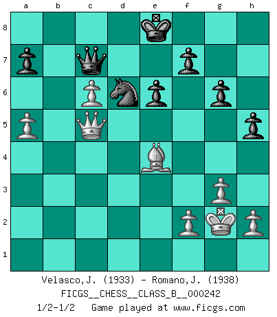 Last move : 1/2-1/2 2016 September 7 19:20:47 [Event "FICGS__CHESS__CLASS_B__000242"] [Site "FICGS"] [Date "2016.05.30"] [Round "1"] [White "Velasco,Jose Maria"] [Black "Romano,Jacopo"] [Result "1/2-1/2"] [WhiteElo "1933"] [BlackElo "1938"] 1.d4 Nf6 2.c4 e6 3.Nf3 b6 4.g3 Ba6 5.b3 b5 6.cxb5 Bxb5 7.Bg2 d5 8.O-O Nbd7 9.Nc3 Ba6 10.Re1 Bb4 11.Bd2 c5 12.a3 Bxc3 13.Bxc3 Ne4 14.Rc1 Nxc3 15.Rxc3 cxd4 16.Nxd4 Bb7 17.Nc6 Bxc6 18.Rxc6 Nf6 19.b4 O-O 20.Qb3 Rc8 21.Rec1 Qd7 22.b5 h6 23.Qb4 Qb7 24.a4 Rxc6 25.Rxc6 Rc8 26.Qc5 Rxc6 27.bxc6 Qc7 28.a5 Ne8 29.e4 dxe4 30.Bxe4 h5 31.Bd3 g6 32.Be4 Kg7 33.Kg2 Nd6 34.Qe5+ Kf8 35.Qc5 Kg7 36.Qc3+ Kf8 37.Qb4 Ke7 38.Qc5 Ke8 1/2-1/2 Queen's Indian : Nimzovich variation (exaggerated Fianchetto) Kingside Castling by player White (move 8) Kingside Castling by player Black (move 19) This chess game ended in a draw. Follow this game move after move (download)Best by test: 1. e4 (Bobby Fischer) Strategie ist, wie man ein Mädchen auf den Rücksitz bekommt. Taktik ist, was man tut, wenn man dann dort ist. (Anonymous) Cuando la partida de Ajedrez termina, el Peón y el Rey regresan a la misma caja. (Irish saying) Nous vivons dans un monde échiquéen : chaque jour qui passe est un défi à relever. (Philosophe Sasha) Tomorrow's what you make of it. (Horatio Caine, C.S.I. Miami)
