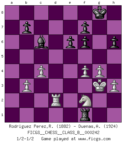 Last move : 1/2-1/2 2016 August 10 12:49:34 [Event "FICGS__CHESS__CLASS_B__000242"] [Site "FICGS"] [Date "2016.05.30"] [Round "1"] [White "Rodriguez Perez,Rene"] [Black "Duenas,Alexis"] [Result "1/2-1/2"] [WhiteElo "1882"] [BlackElo "1924"] 1.e4 c5 2.Nf3 d6 3.d4 cxd4 4.Qxd4 Nc6 5.Bb5 Bd7 6.Bxc6 Bxc6 7.Nc3 e6 8.O-O Nf6 9.Bg5 Be7 10.Rad1 O-O 11.Rfe1 Qa5 12.Qd2 Qb6 13.Qd4 h6 14.Qxb6 axb6 15.Bc1 Rfd8 16.Nd4 Rac8 17.a3 Be8 18.Nf3 Rc4 19.Nd2 Rc7 20.Nb3 Ng4 21.f4 Rc4 22.Rd3 Rdc8 23.Nd2 R4c7 24.Nf3 Rc4 25.Bd2 b5 26.b3 R4c5 27.h3 Nf6 28.g4 Ra8 29.Bc1 d5 30.exd5 b4 31.axb4 Rxc3 32.Rxc3 Bxb4 33.Rd3 Bxe1 34.Nxe1 Nxd5 35.Kf2 Bc6 36.Be3 Ra2 37.Rd2 Ra1 38.Bd4 Rb1 39.Nd3 Rh1 40.c4 Nf6 41.Bxf6 gxf6 42.Kg3 Rf1 43.Nf2 1/2-1/2 Sicilian, Chekhover variation Kingside Castling by player White (move 8) Kingside Castling by player Black (move 10) This chess game ended in a draw. Follow this game move after move (download)Nothing excites jaded Grandmasters more than a theoretical novelty. (Dominic Lawson) Später, ... hatte ich zunehmend Erfolg in entscheidenden Partien. Vielleicht weil ich eine einfache Wahrheit erkannte: nicht nur ich hatte Angst, auch mein Gegner. (Mikhail Nekhemyevich Tal) En el Ajedrez, tal como en la vida, las bendiciones de hoy pueden ser el veneno del mañana. (Assaic) Assurément je connaissais par expérience le mystérieux attrait de ce jeu royal, le seul entre tous les jeux inventés par les hommes qui échappe souverainement à la tyrannie du hasard, le seul où l'on ne doive sa victoire qu'à son intelligence ou plutôt à une certaine forme d'intelligence. Mais n'est-ce pas déjà le limiter injurieusement que d'appeler les échecs un jeu ? N'est-ce pas une science, un art ou quelque chose qui, comme le cercueil de Mahomet entre ciel et terre, est suspendu entre l'un et l'autre, et qui réunit un nombre incroyable de contraires ? [...] C'est une pensée qui ne mène à rien, une mathématique qui n'établit rien, un art qui ne laisse pas d'uvre, une architecture sans matière; et il l'a prouvé néanmoins qu'il était plus durable, à sa manière, que les livres ou que tout autre monument, ce jeu unique qui appartient à tous les peuples et à tous les temps, et dont personne ne sait quel dieu en fit don à la terre pour tuer l'ennui, pour aiguiser l'esprit et stimuler l'âme. Où commence-t-il, où finit-il ? (Stefan Zweig) Beep ! (R2D2 in Star Wars ep.3)